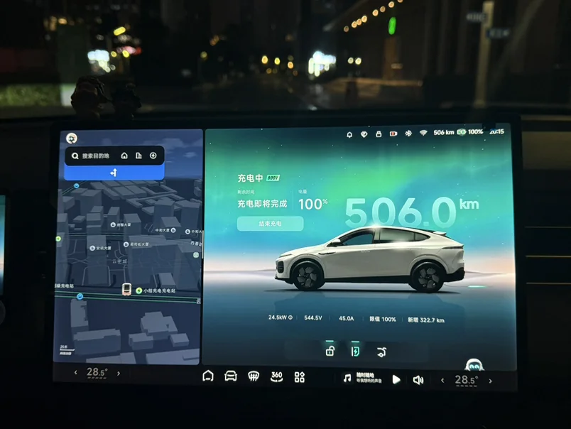 最惊艳的是充电速度,真是“咖啡没凉就满电”!电量33%充到100%仅用30多分钟,10分钟就补了40%电量,峰值功率拉满,比加油还省时间。充电时车机实时显示进度,科技感十足,刷几条短视频的功夫,续航就满血复活。