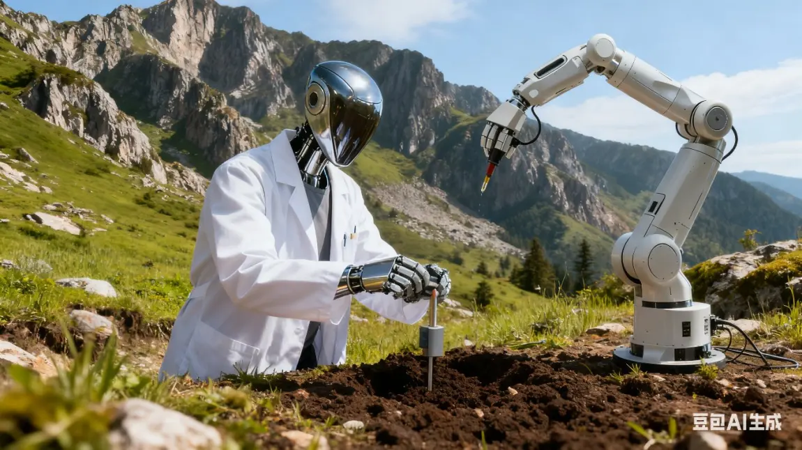 不止是实验室的严谨,野外科考现场也有它的身影 —— 崎岖的山地旁,它正精准采集土壤样本,机械臂操作采样器的力度恰到好处,荒野的自然绿意里,它的白色机身倒显出几分可靠。