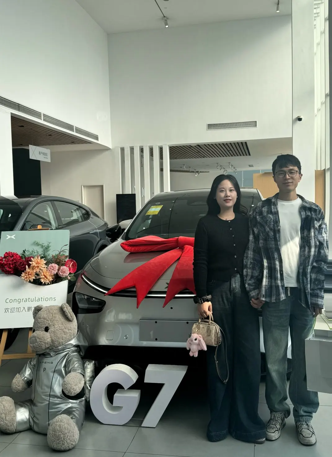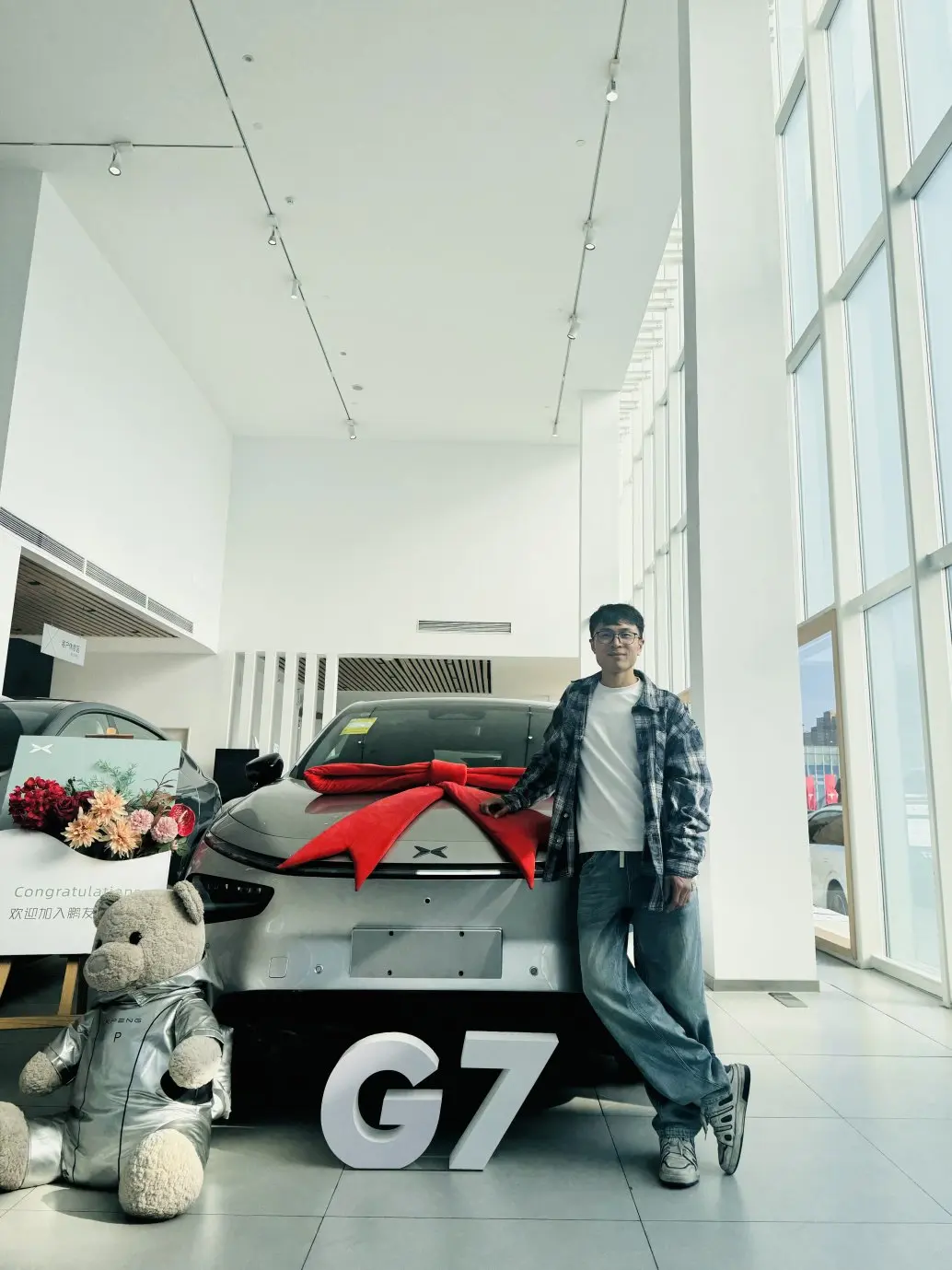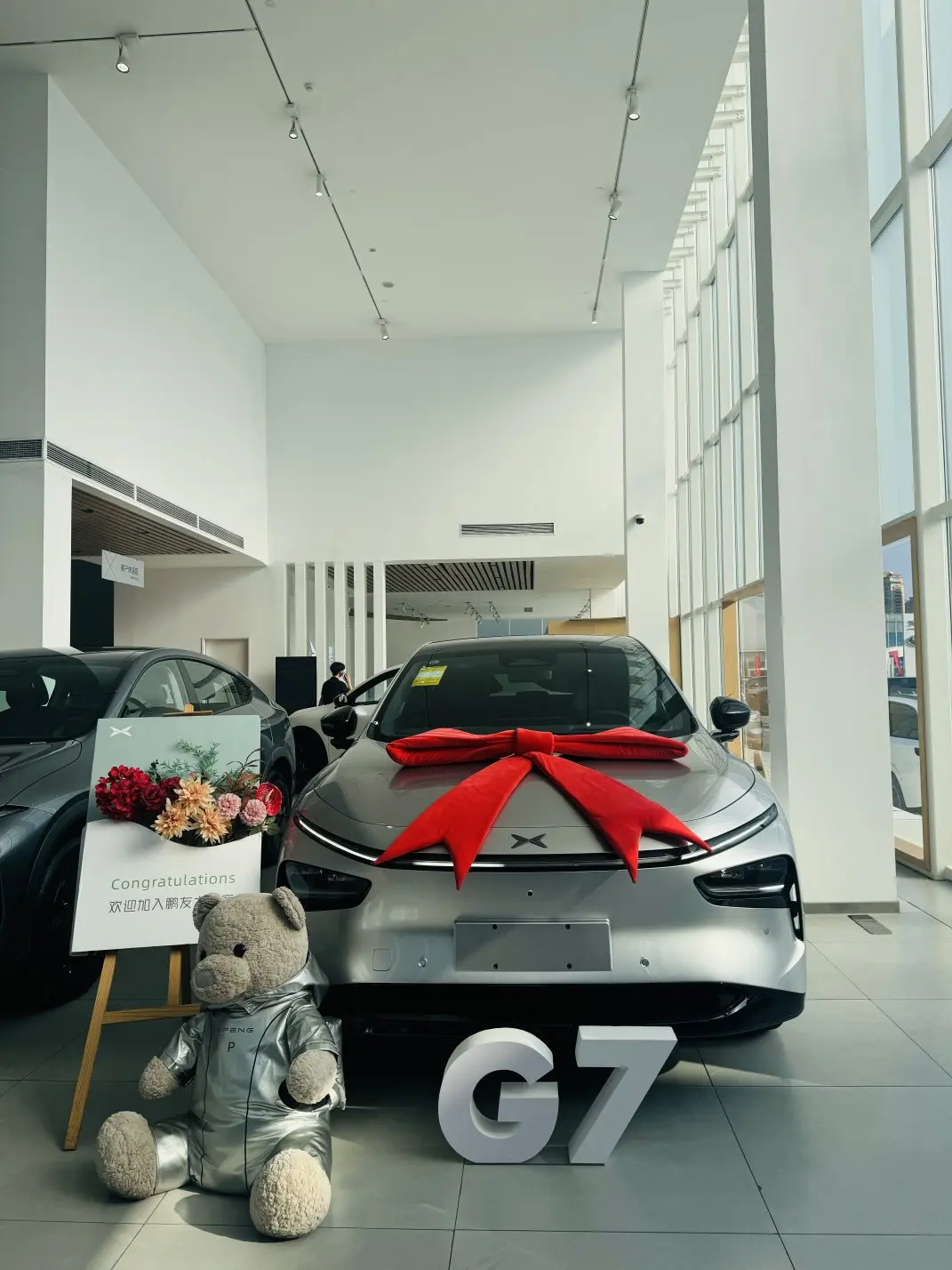 2025款小鹏G7 Ultra提车啦~星际银外观搭配深空灰内饰,实车颜值比图片更惊艳,阳光下车身线条流畅利落,回头率超高!交付流程超高效,1.5小时就办完所有手续,专属提车区的鲜花和定制小礼品,仪式感直接拉满。