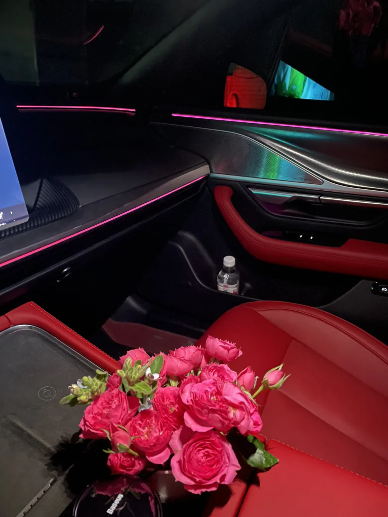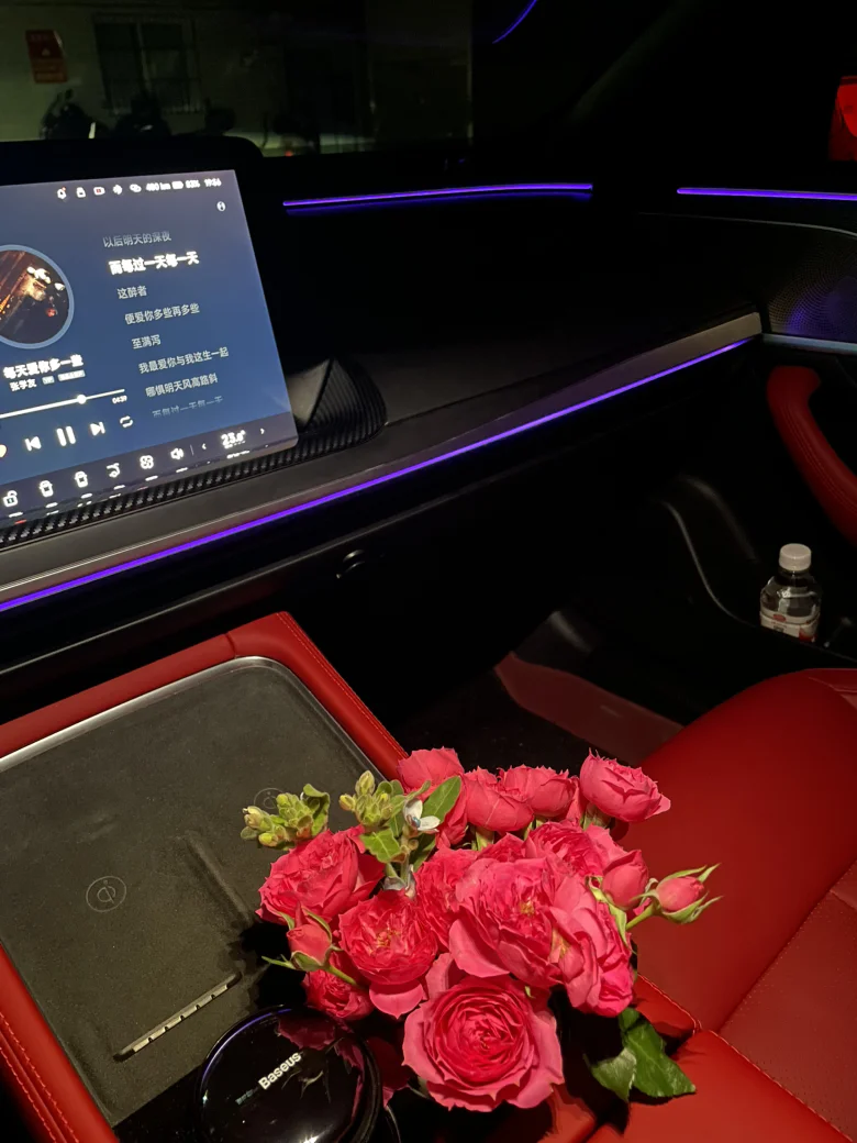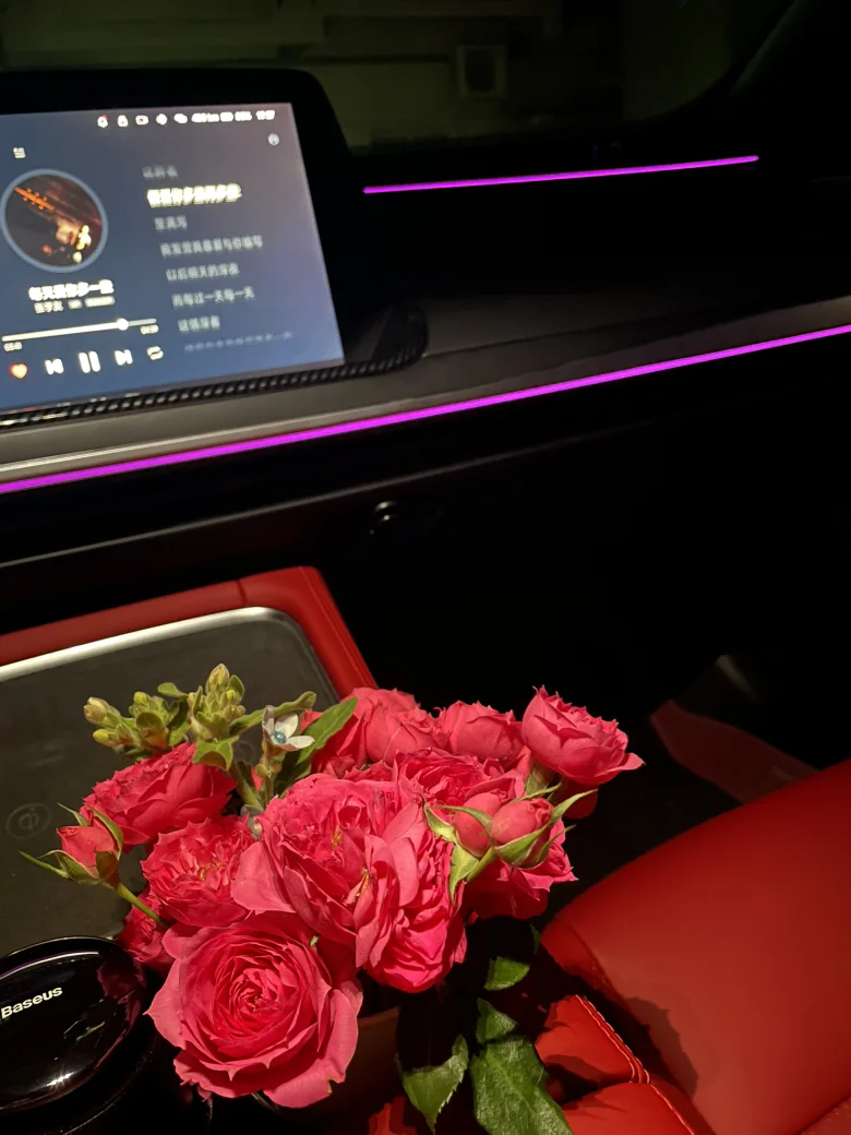 #我的副驾故事# 暮色裹着车厢时,副驾就是我的移动花园。屏幕里正淌着《再靠近一点》的旋律,紫灯带把空气晕成松弛的蓝,那捧玫红玫瑰偏要撞进这温柔里——花瓣裹着绒绒的光,连花骨朵都浸着甜意,往扶手箱上一放,连瓶矿泉水都沾了点浪漫的边角。方向盘是生活的方向,副驾这方小天地,是随时能揣走的春天。