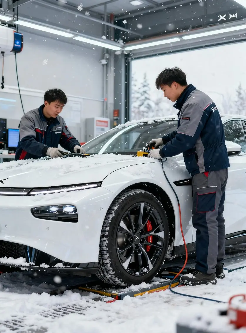 白色P7+停在雪堆里像只裹了糖霜的大玩具,上周降温后我远程打开了电池预热,中控屏弹出“冬季胎压监测提醒”时,服务群里的专员已经主动发来了附近24h养护点的位置。