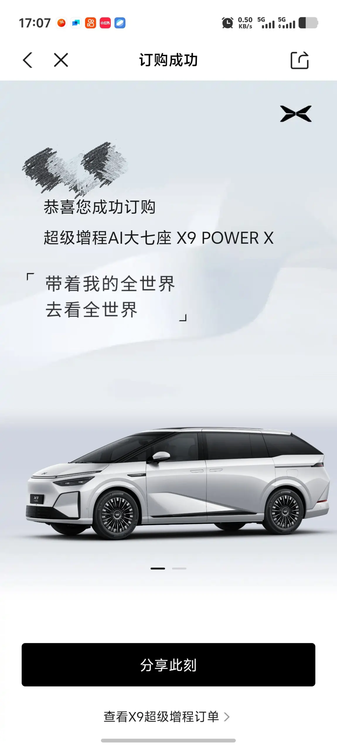 ✨终于给X9增程版锁单啦!对小鹏的好感藏了好久,试驾过好几款都念念不忘~ 这次果断下手,完全抵不住它的魅力! 盼着早日提车,以后带着家人去兜风、去旅行,把每段时光都过得热气腾腾~ 相信这辆大伙伴,会给生活加满幸福感和情绪价值呀!🚗💨