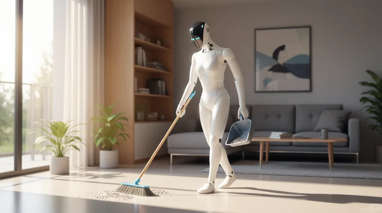 #小鹏Iron在身边# 小鹏Iron机器人正在客厅中进行清洁工作。它稳健的双腿在光滑的地面上行走,一只机械手臂握着扫把清扫地面的灰尘和杂物,另一只机械手臂拿着簸箕配合使用。机器人头部的传感器不断扫描周边环境,确保清洁无死角。阳光透过窗户照射在它白色的人造皮肤上,反射出耀眼的科技感光芒,整个场景充满了未来科技与日常生活的融合。