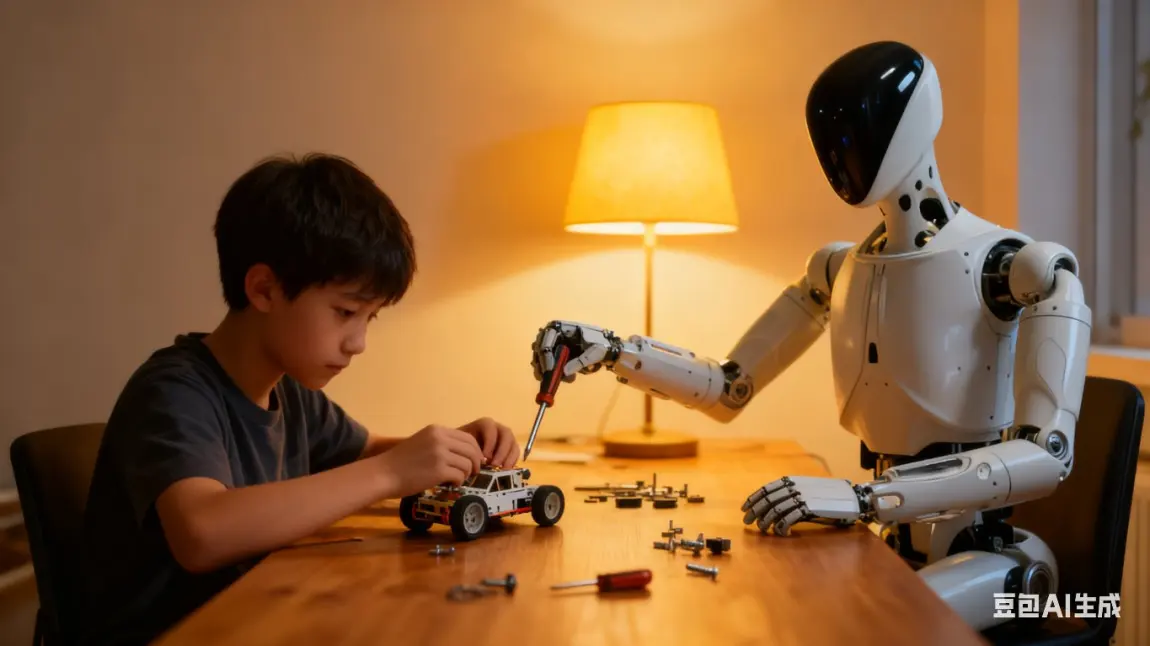 #小鹏Iron在身边# 作为一个喜欢玩微缩模型的小鹏车主,当我看到这个话题的时候脑子里就自动把iron机器人和拼装模型结合在了一起,我让ai生成了一个iron机器人陪着一个小男孩拼车模的场景。在模型制作过程中,一些细微的拼装和粘贴是考验制作水平的关键点,有一个稳定让人有安全感的iron机器人的帮助,未来的模型爱好者能够制作出更加完美的模型