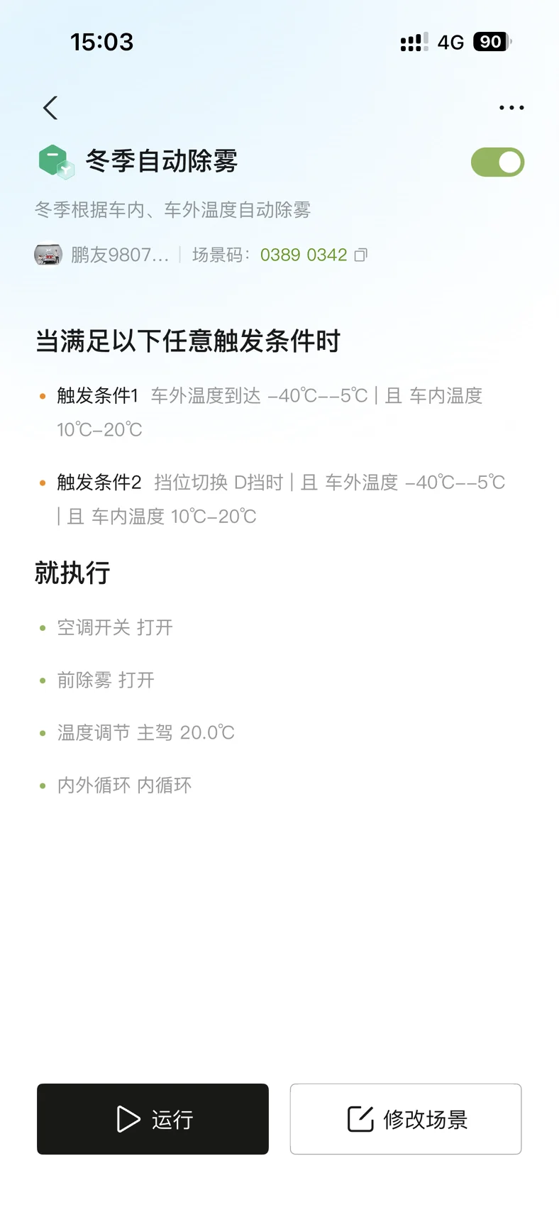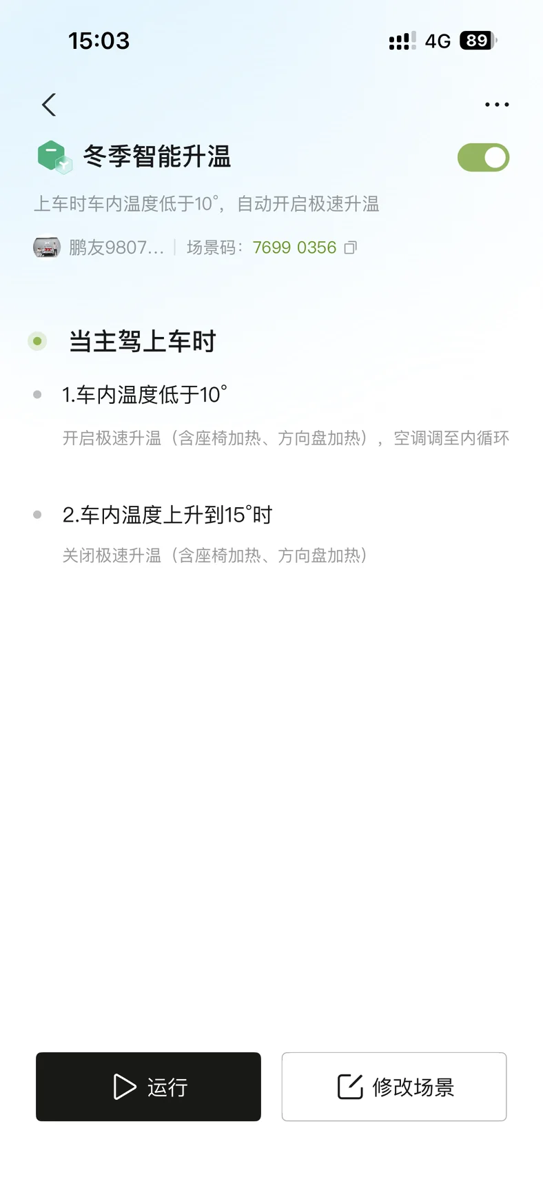 远程启动车辆后,使用“除霜除雾”功能一键清除车窗雾霜,确保视线清晰。 热管理系统优势 自定义智慧场景:通过APP设置自动化任务,例如低温时自动开启加热功能。(我己添加几个智慧场景有需要的朋友可以参考)