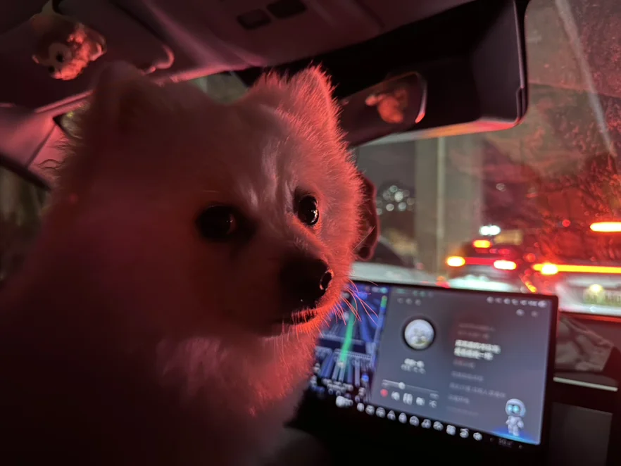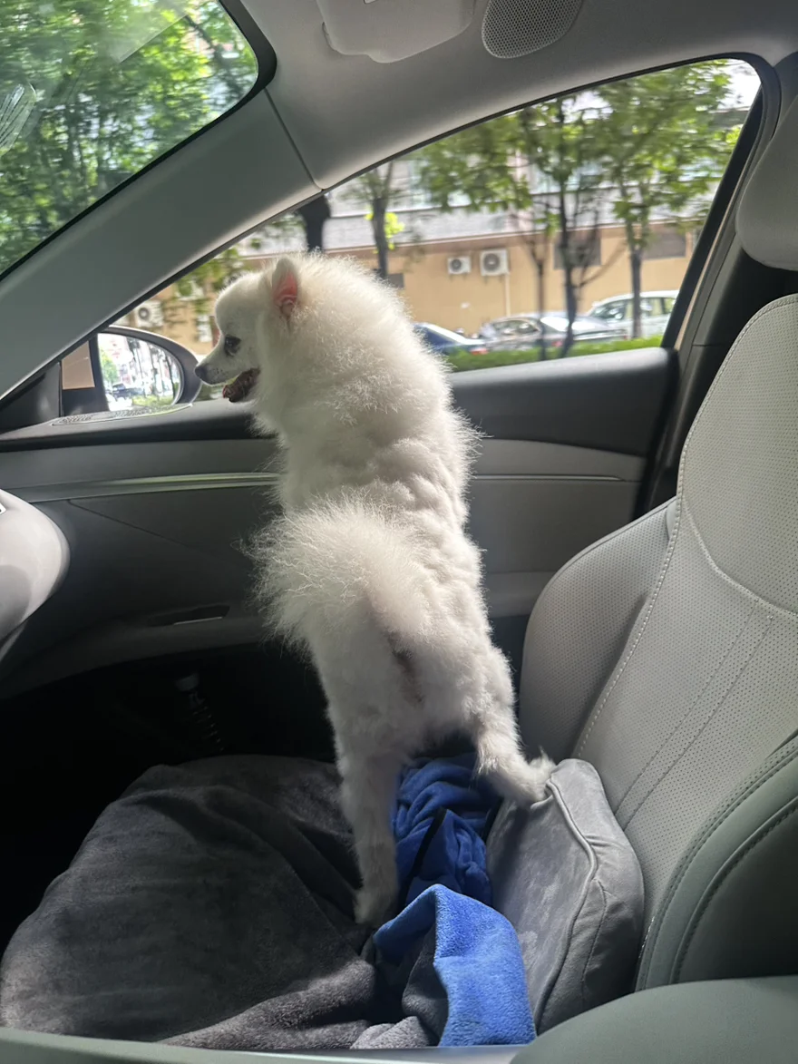 我的副驾,是一只叫“糖糖”的小博美的专属领地——它的小毯子永远铺得软软的,旁边还放着它最爱的草莓小玩具,连空调出风口都挂着它的小骨头香片。