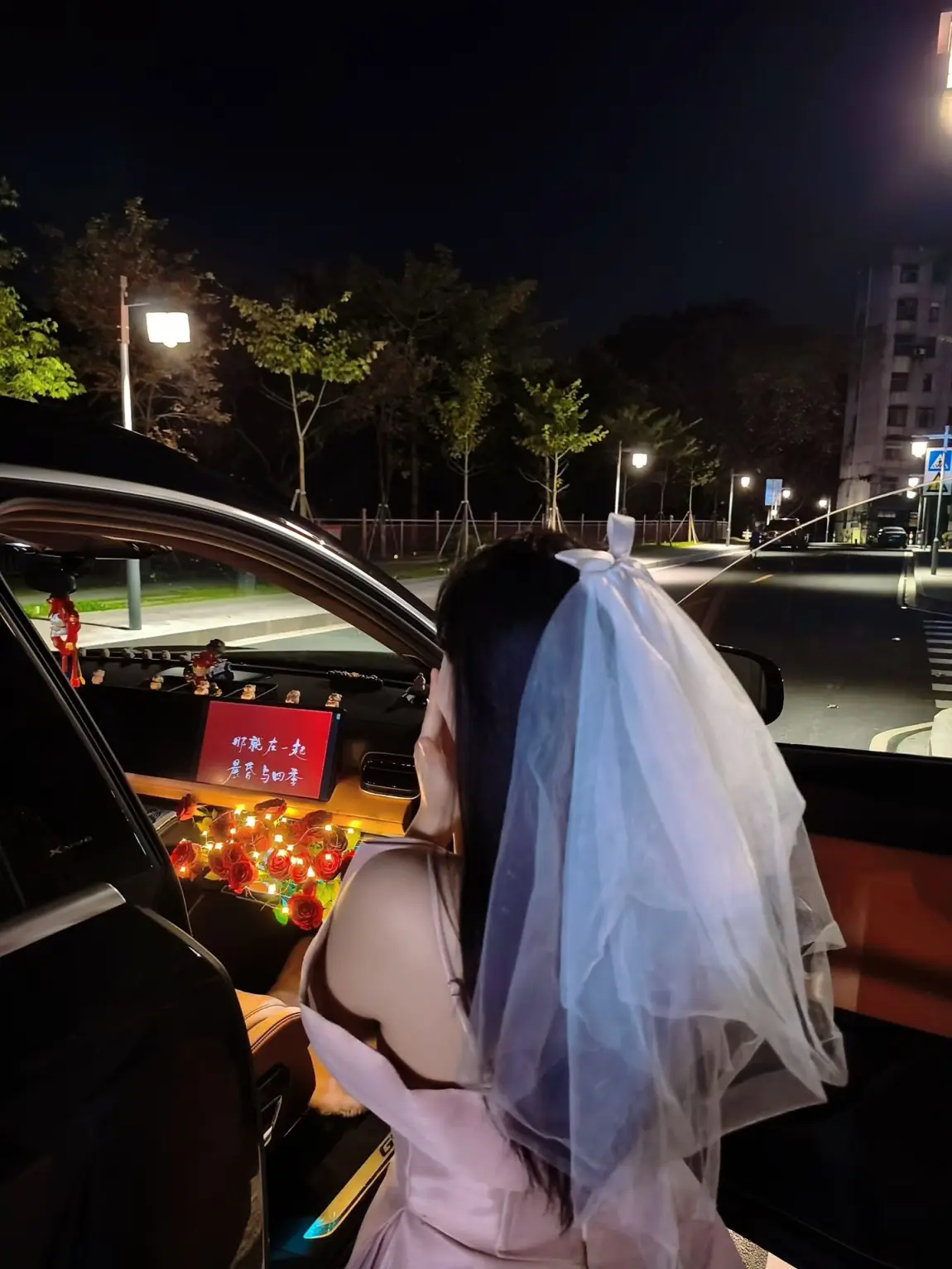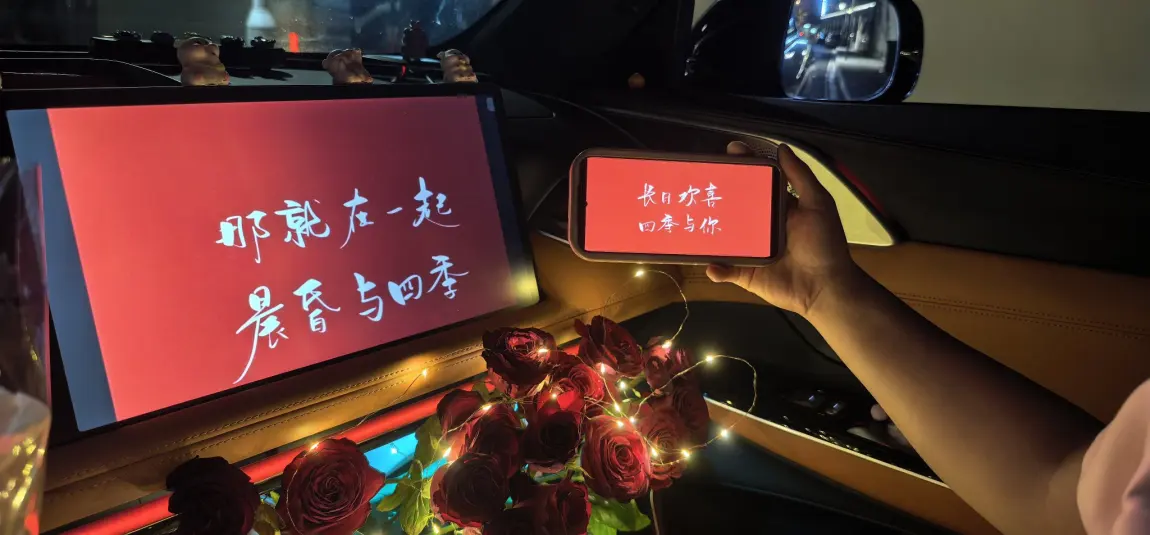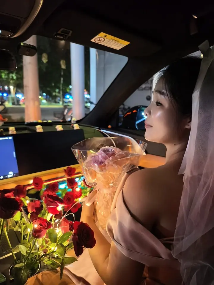 #我的副驾故事# 那晚把车停在常散步的路边,提前偷偷把副驾塞得满是暗红玫瑰,串灯缠在花茎上暖得像心跳。她拉开门愣了两秒,软纱头纱垂在肩前,盯着屏幕上的字笑出泪,攥着那束粉玫瑰的手指都有点发颤——原来最亮的不是车里的灯,是她点头时眼里的光,满满的感动,求婚成功啦~