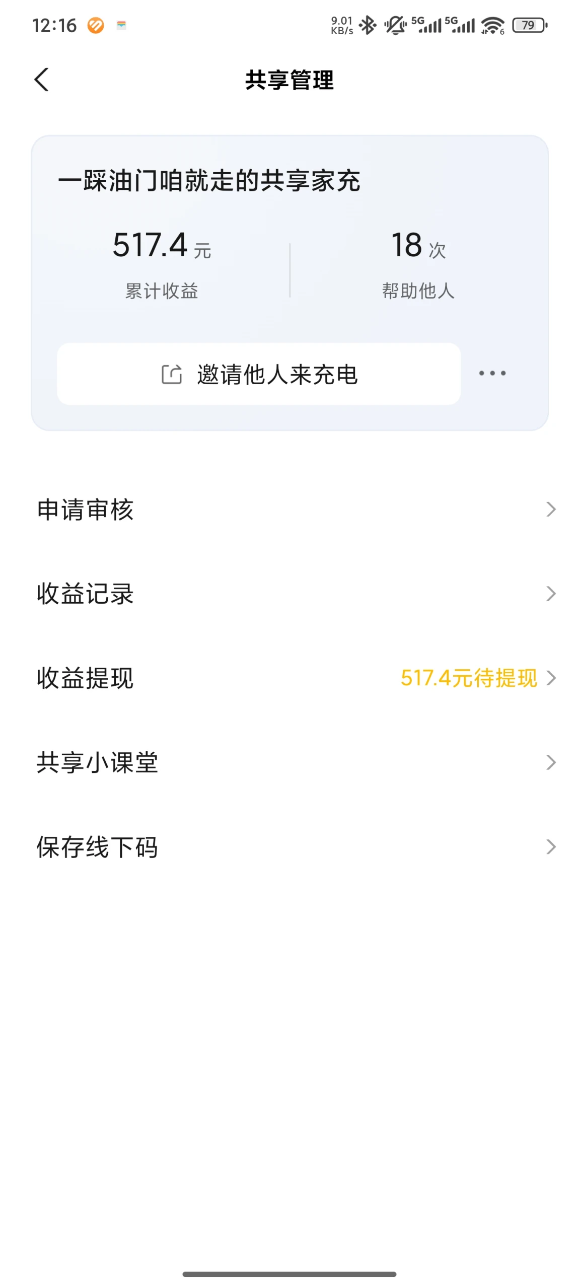开通共享充电快半年了,由于我家装在地库,基本上只有一两个邻居会用,也就是给自己省点电费。