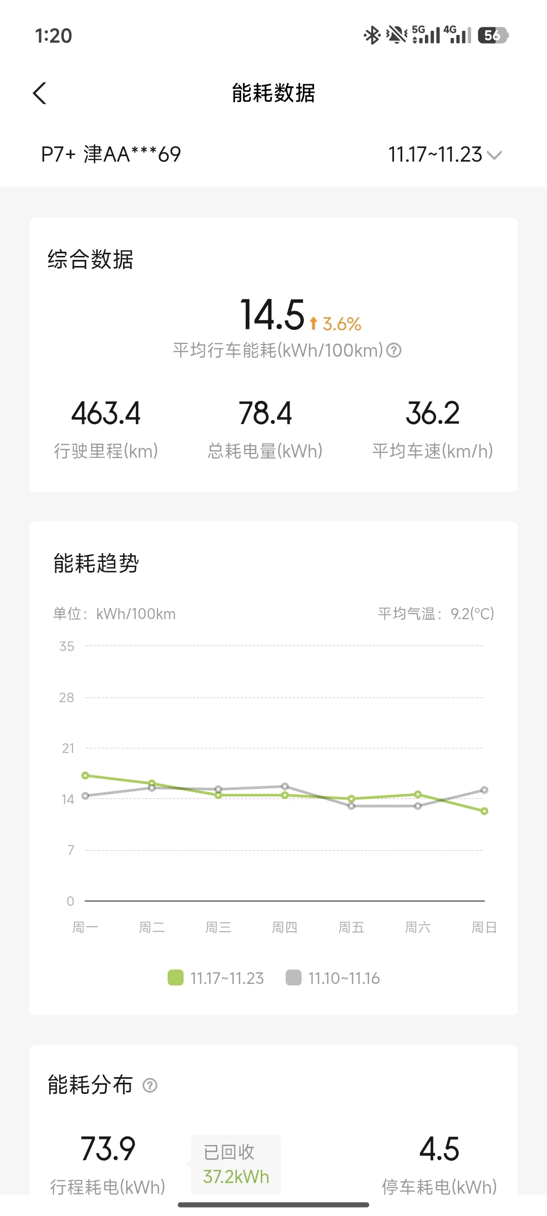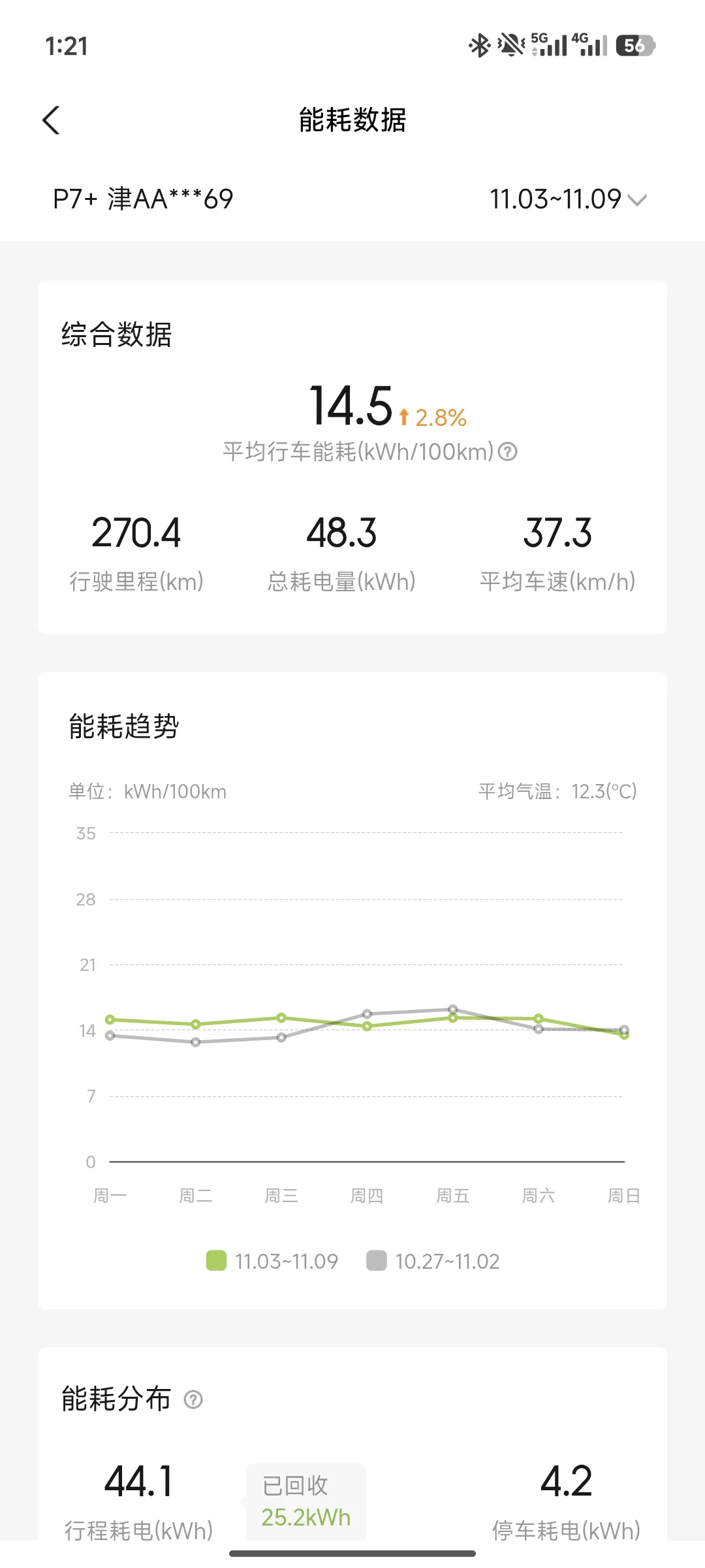 作为纯电出行核心指标,本月能耗随气温变化呈现清晰规律。市区通勤以经济模式+低动能回收为主,日常单程25公里含早晚高峰拥堵,气温10-18℃时百公里电耗稳定在12-13kWh;下旬气温降至5℃以下后,开启座椅加热+24℃空调内循环,电耗微增至14-15kWh,续航达成率仍保持在75%以上。
