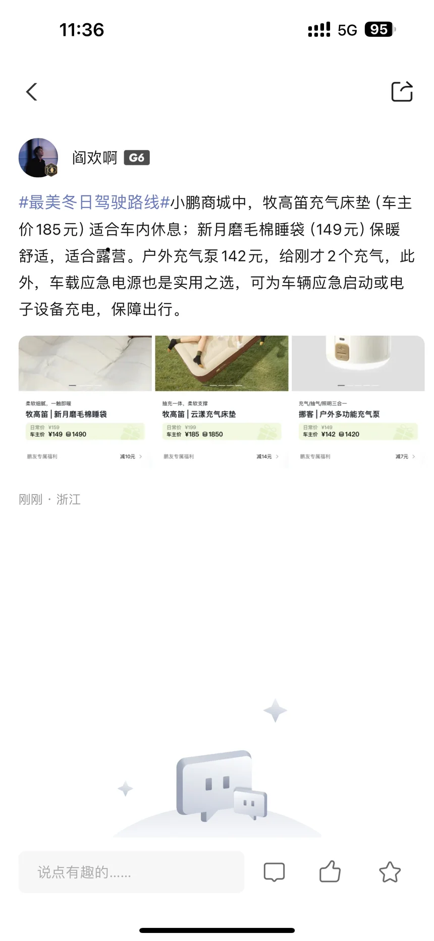#最美冬日驾驶路线# 小鹏商城中,牧高笛充气床垫(车主价185元)适合车内休息;新月磨毛棉睡袋(149元)保暖舒适,适合露营。户外多功能充气泵142元可以给刚才2个充气。此外,车载应急电源也是实用之选,可为车辆应急启动或电子设备充电,保障出行。