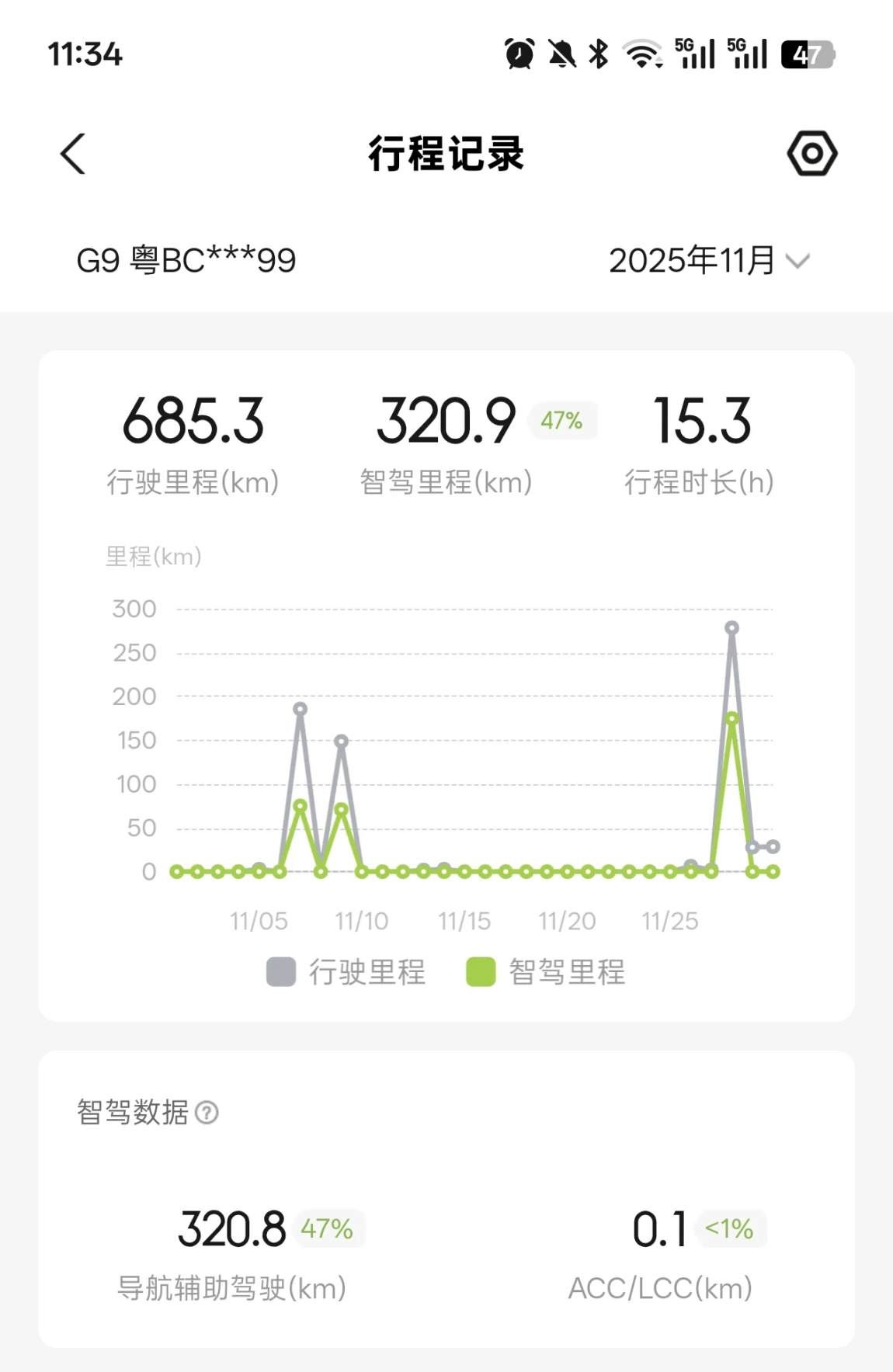 十一月广东气温逐渐转凉,小鹏G9的表现依旧稳定。本月累计行驶680公里,以高速通行为主,低温对续航的影响较上月略有增加,但仍在合理范围内。