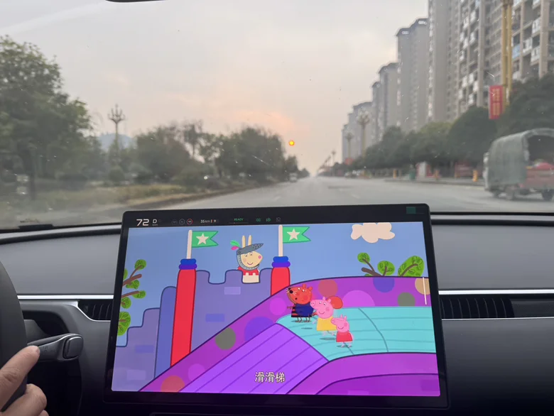 刚开上回家路,后排人类幼崽就把中控屏征用了——《小猪佩奇》直接安排上,屏幕亮起来的瞬间,娃的“上车哭闹KPI”当场清零。窗外是橘红色的落日挂在灰蒙蒙的天边,车里是佩奇一家滑滑梯的BGM,这混搭氛围,主打一个“赛博带娃,效率拉满”。🤭🤭