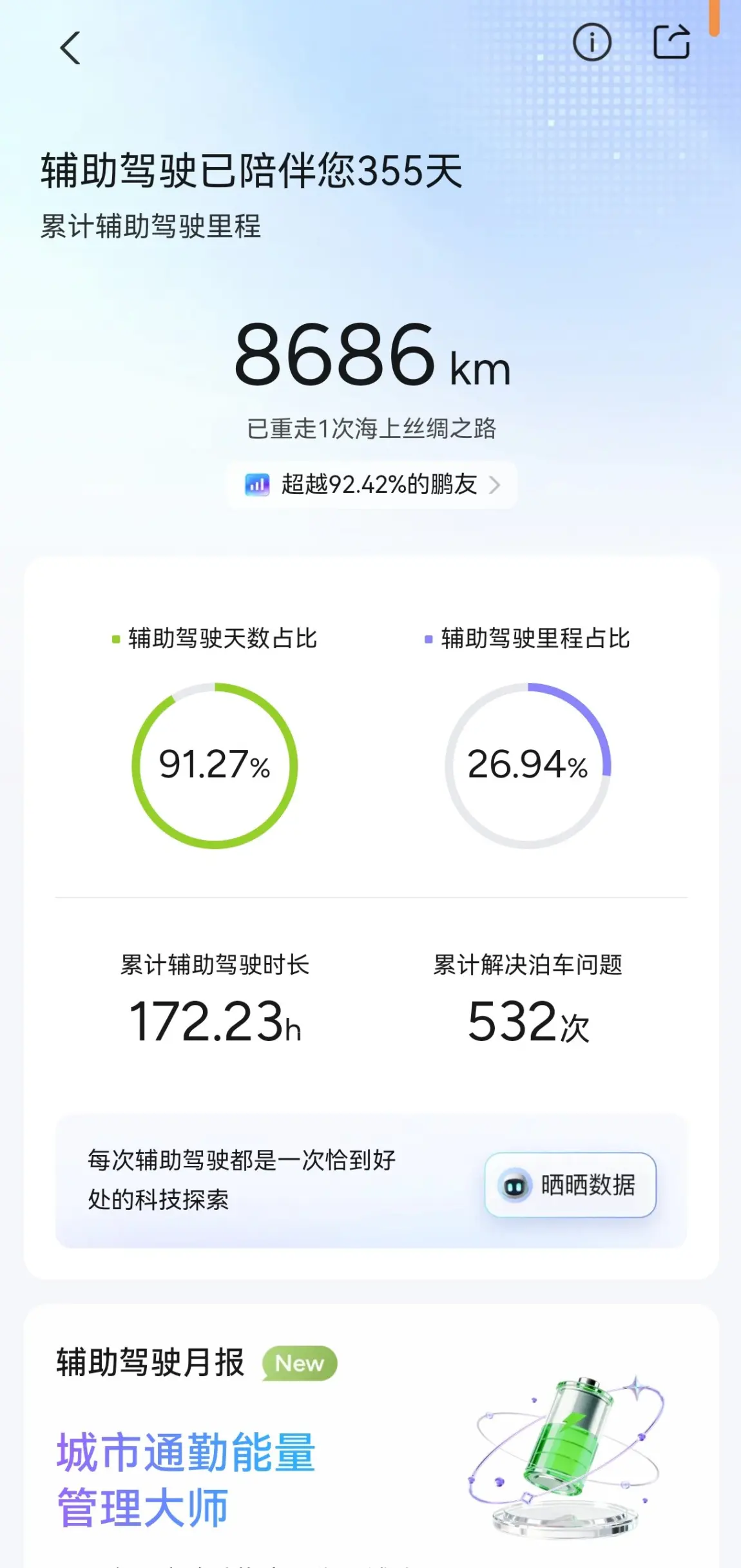#小鹏汽车 #小鹏辅助驾驶开了小鹏p7+将近1年 了,以前油车一年才开1万多公里,换了电车1年就开了3万多。出去玩用智驾多点,上下班比较赶时间,智驾有点慢,大多数都自己开。个人体验而言,智驾方面虽然小问题也有,但总体还行,大部分时候不需要接管,特别开长途轻松好多,而且续航很扎实,春秋不开空调实际可以开到600多公里。