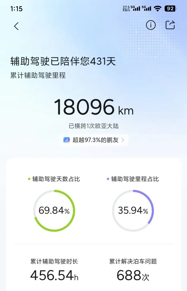 - 累计到现在,智驾已经陪我跑了18096km,相当于跨了次欧亚大陆,比97.3%的鹏友都用得多。
