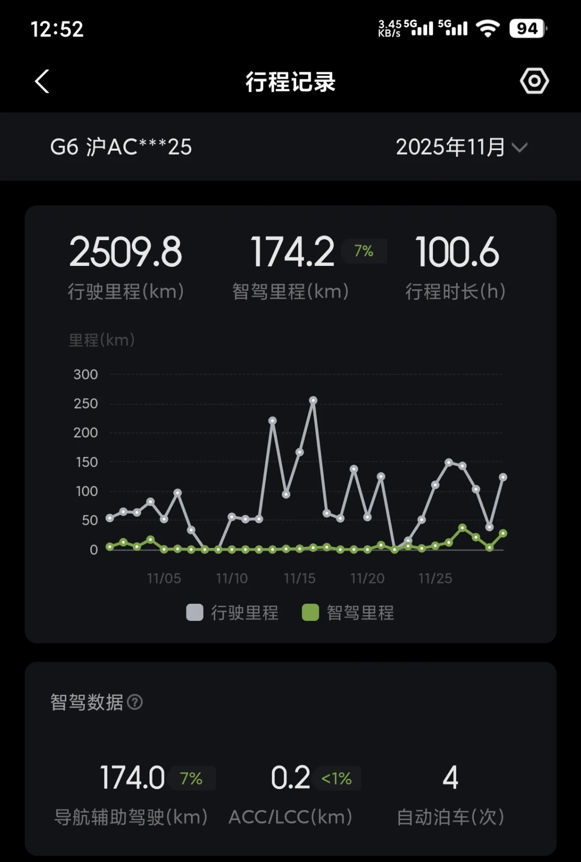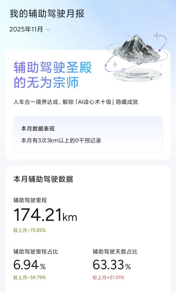 - 整个11月跑了2509.8km,其中智驾里程174.2km(占比约7%),主要是日常通勤用智驾比较多,这个月还解锁了“辅助驾驶圣殿的无为宗师”称号,有3次3km以上的0干预智驾记录~