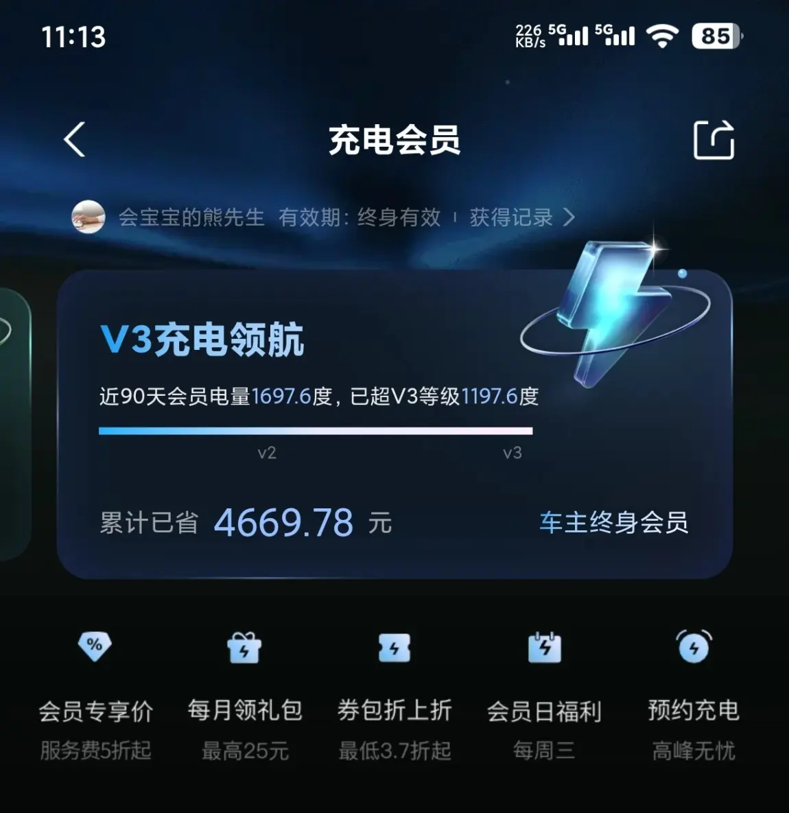 而且我是车主终身充电会员,近90天已经省了4669.78元了——自营站充电不用操心找桩、排队,App里直接看空闲桩,到了就能充,加上会员价,比加油便宜太多,日常通勤基本不用心疼电费