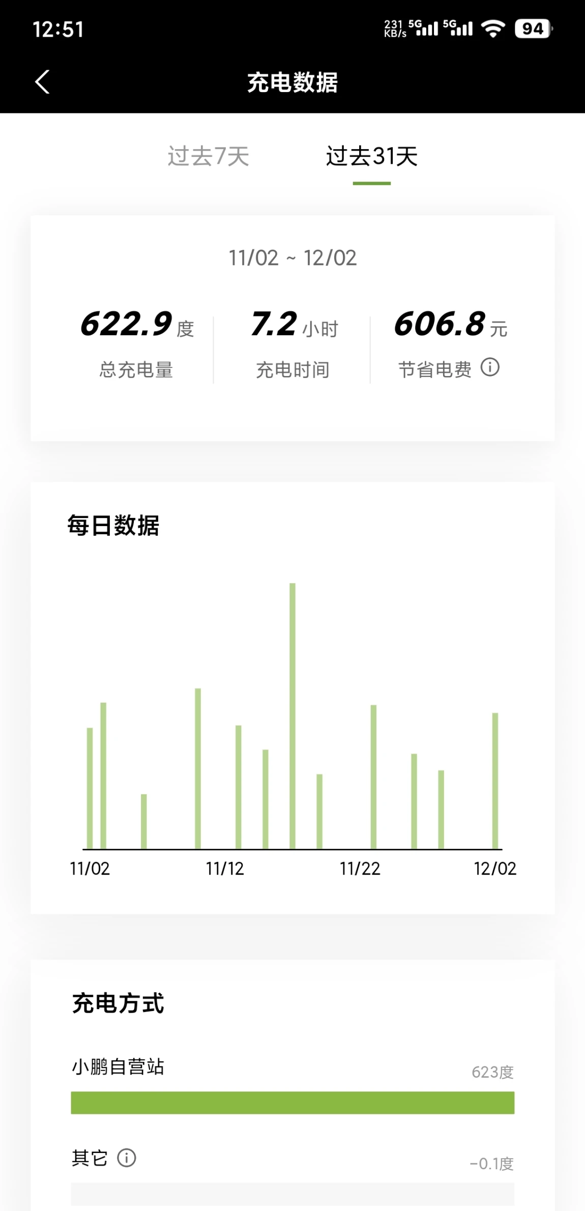11月充电充了622.9度,全在小鹏自营站充的,总共才花了点服务费,算下来直接省了606.8元!