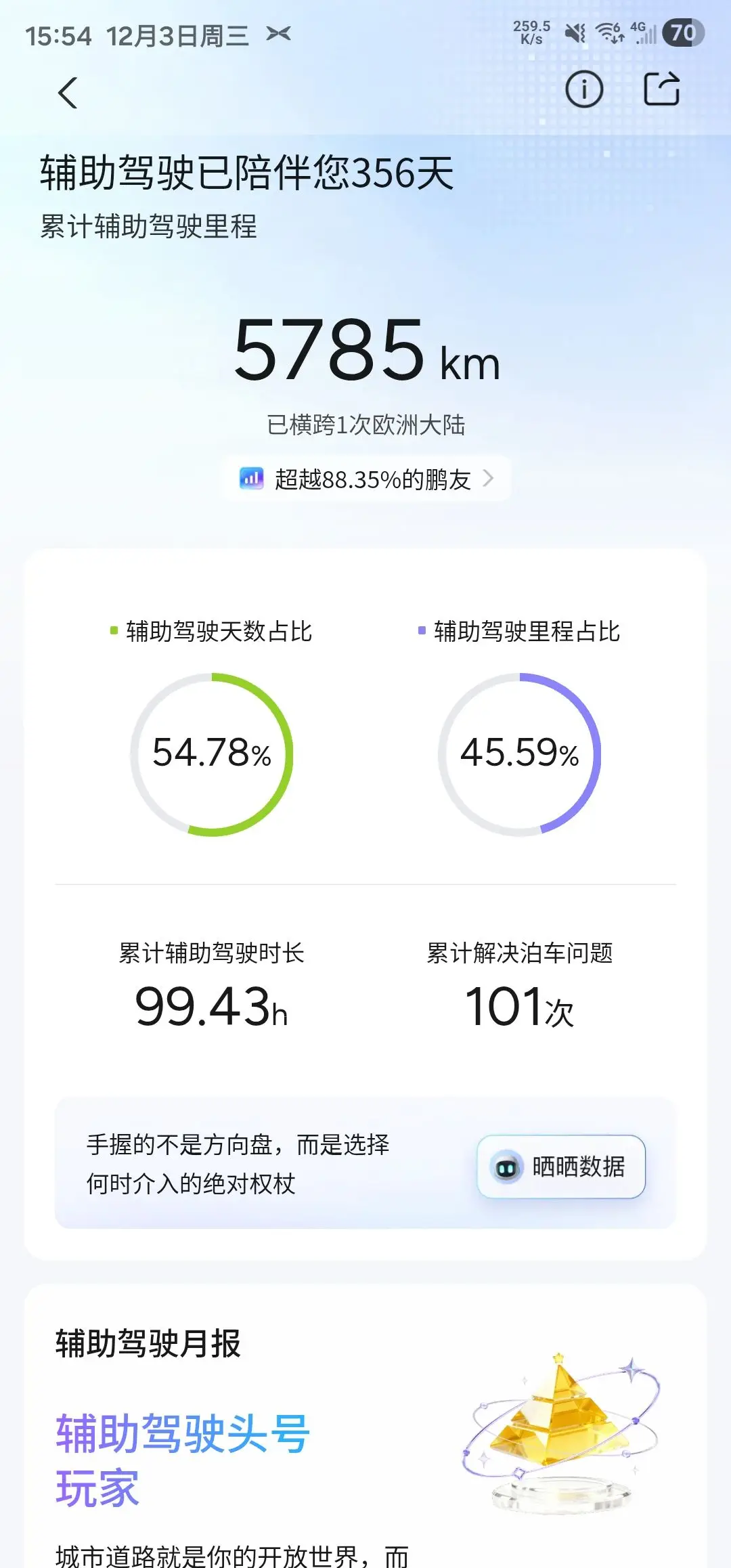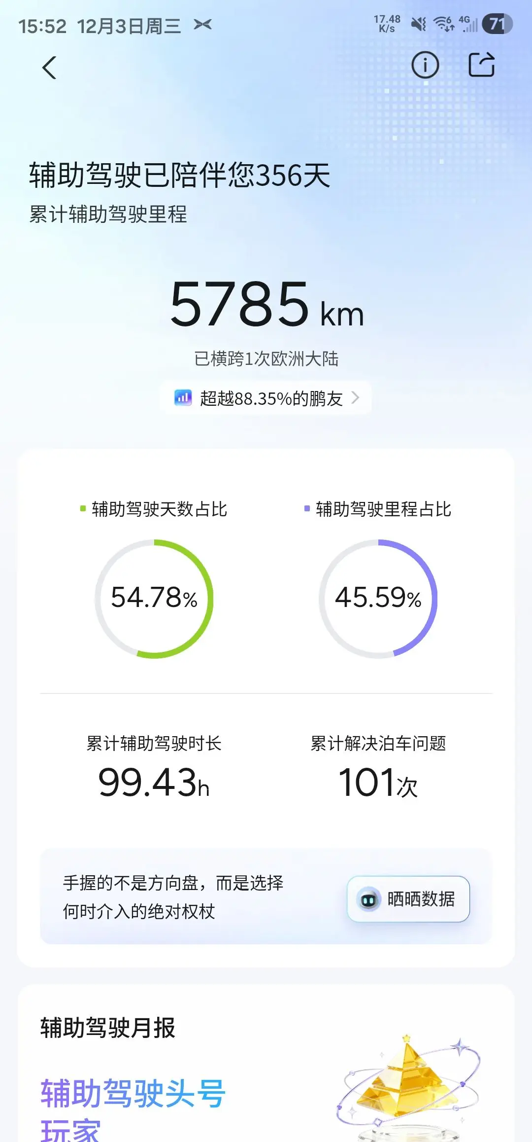 翻完小鹏智驾通行证的数据,才清晰这一年的智能出行日常:累计辅助驾驶里程5785km,占总里程的45.59%,还超越了88.35%的鹏友,辅助驾驶天数占比也达到54.78%,几乎一半时间都靠它省心出行~