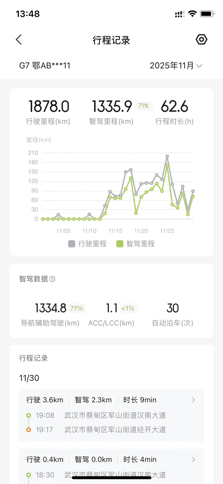 本月驾驶小鹏 G7(XOS 5.8.5.8906),累计行驶 1878.0 km,其中 71%(1335.9 km) 由辅助驾驶完成,行程总时长 62.6 小时。导航辅助驾驶占比高达 71%,ACC/LCC仅 1.1 km,自动泊车使用 30 次,日常通勤与长途均高度依赖智驾。