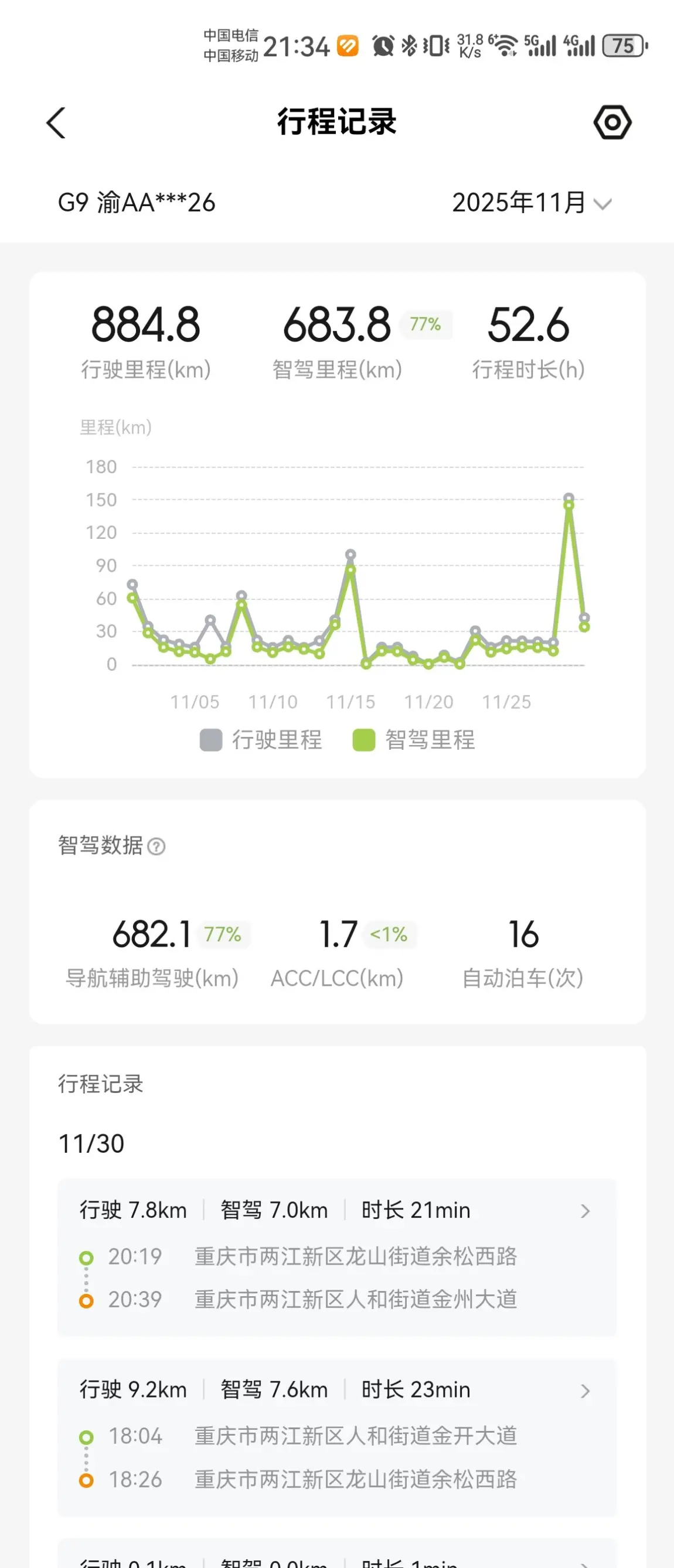 #11月用车总结# 十一月的山城,G9伴我穿行于灯火阑珊。884.8公里的征途,智驾里程如诗般铺展,占77%的路程,让每一次出行都轻松自如。52.6小时的行程,16次自动泊车,每一次都精准优雅。智驾,让驾驶成为享受,让旅途充满诗意。12月你好,11月再见