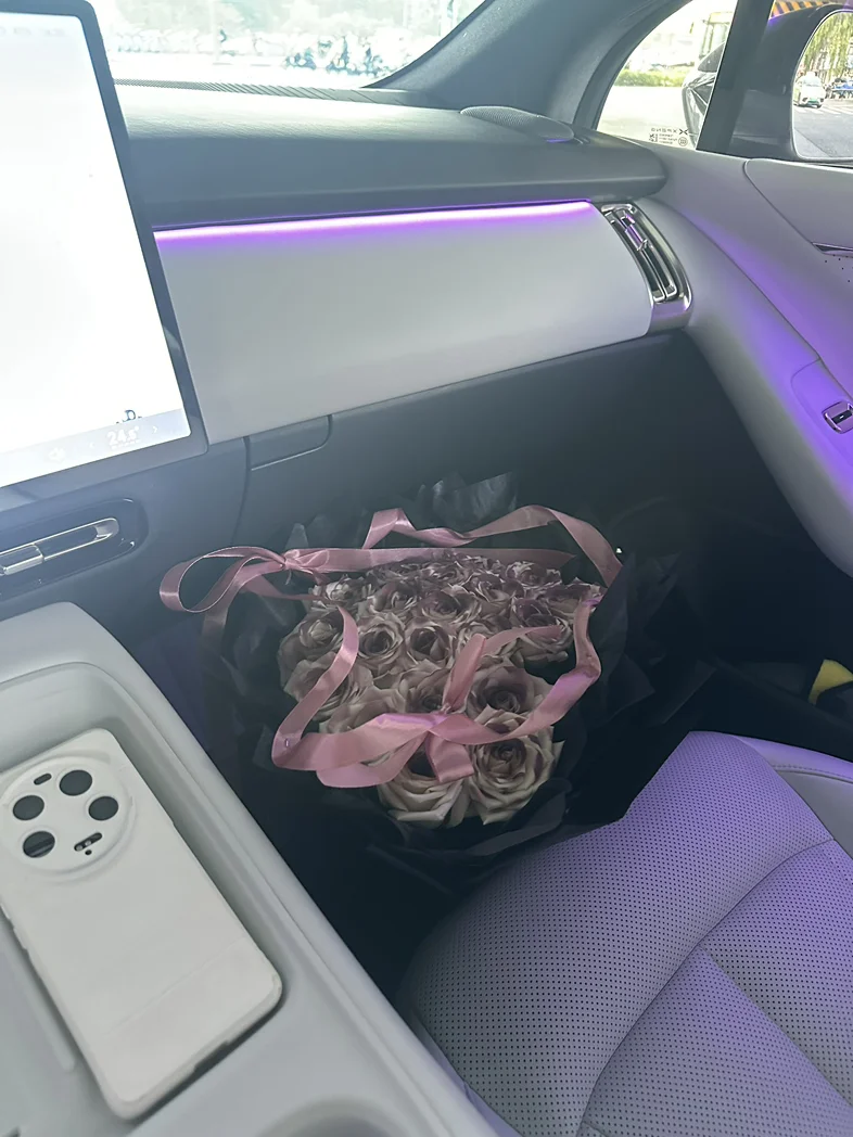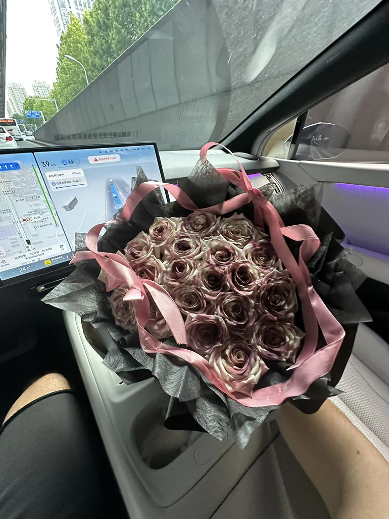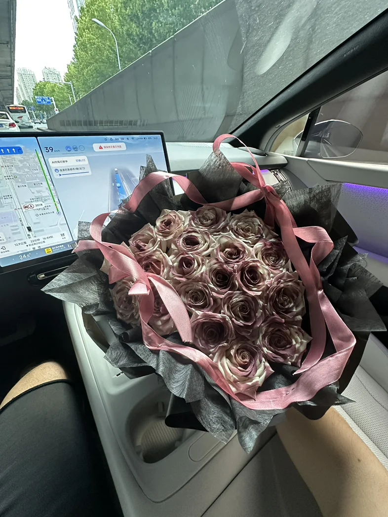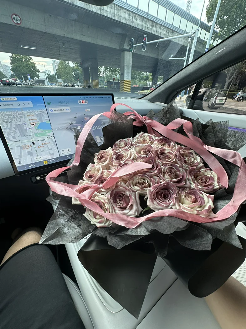 前几天收到一束超好看的玫瑰,没舍得放家里,直接抱到车里往副驾一摆,嘿,瞬间整个车厢都亮堂了!粉棕调的玫瑰配着车内的氛围灯,连平时看腻了的中控屏都顺眼多了。我这人特矫情,开车就喜欢有点小美好,洗干净的车、好闻的香薰,再加上这束花,哪怕只是上班通勤堵在路上,瞅一眼副驾的花,心里也软软的,一点不烦躁。