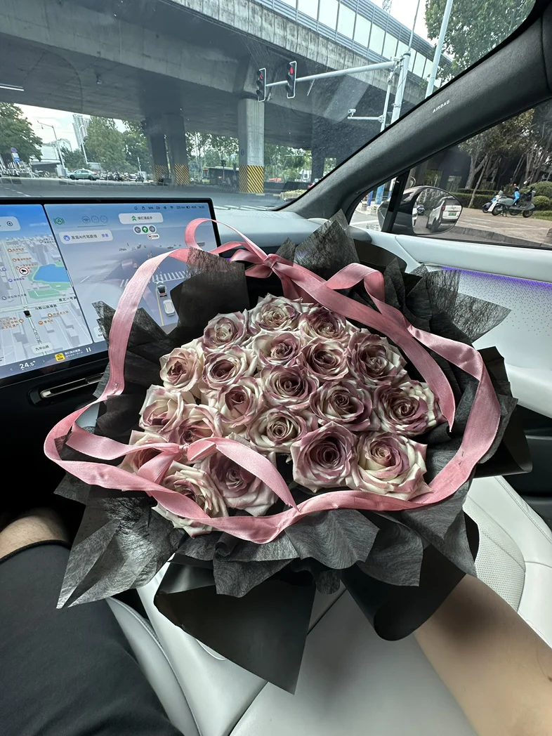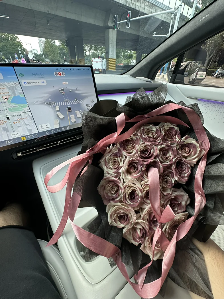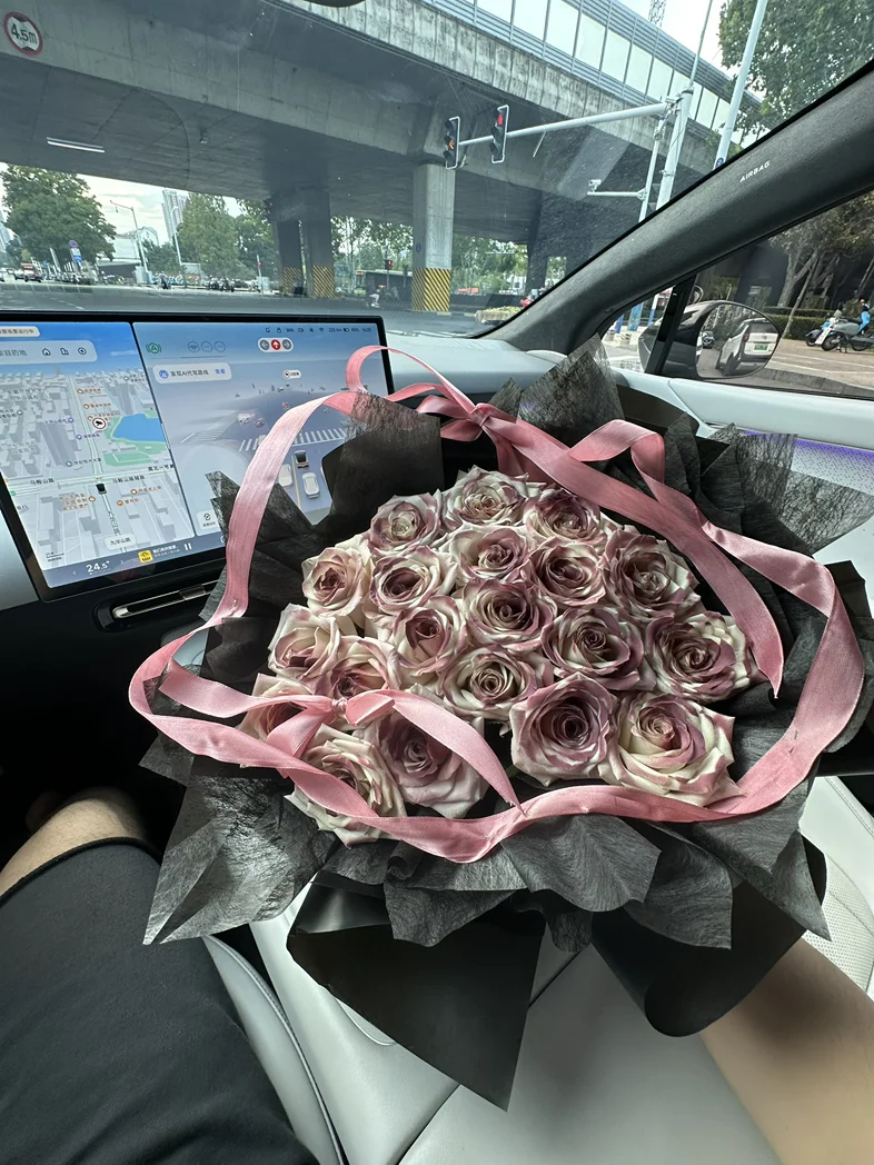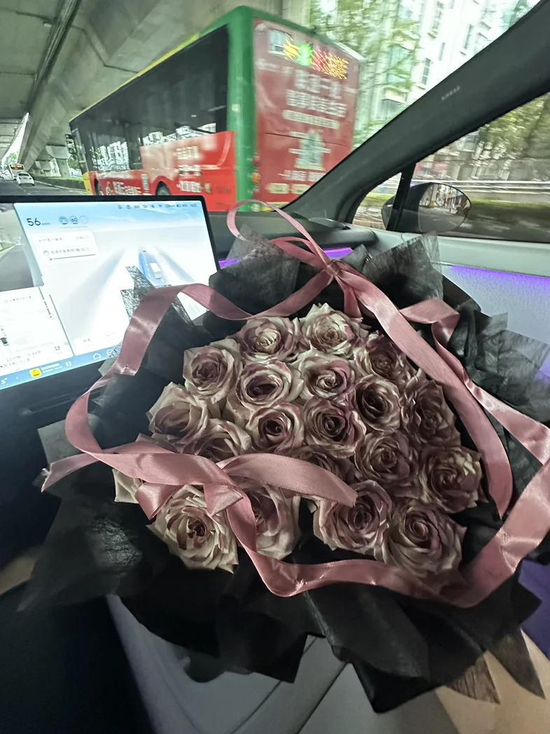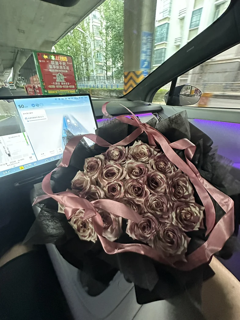 前几天收到一束超好看的玫瑰,没舍得放家里,直接抱到车里往副驾一摆,嘿,瞬间整个车厢都亮堂了!粉棕调的玫瑰配着车内的氛围灯,连平时看腻了的中控屏都顺眼多了。我这人特矫情,开车就喜欢有点小美好,洗干净的车、好闻的香薰,再加上这束花,哪怕只是上班通勤堵在路上,瞅一眼副驾的花,心里也软软的,一点不烦躁。