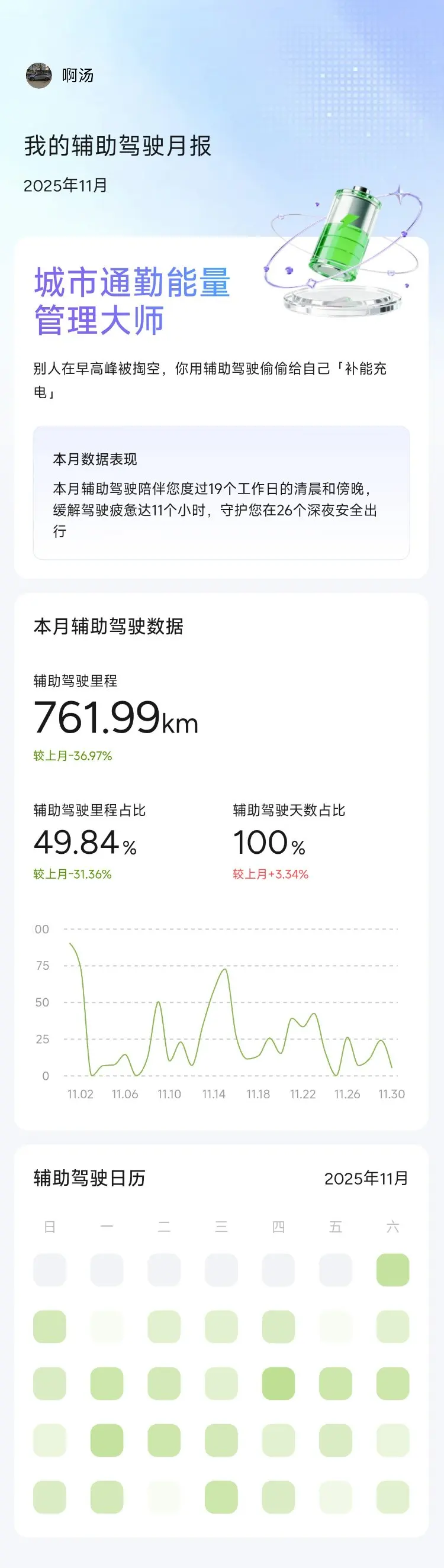 #11月用车总结# @鹏友俱乐部 这个月用车明显比之前多了不少,主要是因为谈了对象哈哈,基本一半的里程是用智驾的,由于我的车是四驱性能版,所以在不需要导航的路段我还是自己开来体验双电机带来的充沛动力,智驾和人驾达到了比较完美的平衡,能耗是我这个老6车主最不需要担心的了,四驱版G6这个能耗只能说很牛了,这个月还更新了大的版本,车位到车位焕新版以及AI音效我比较喜欢,期待后续版本带来更好的体验!