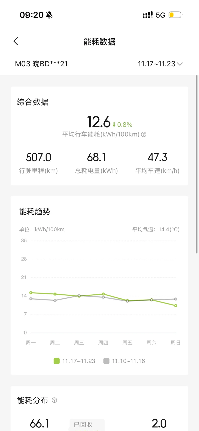 能耗表现是真惊喜:这一周平均车速47.3km/h,加上14.4℃的气温刚好适合电车,能耗趋势稳中有降,越开越省!