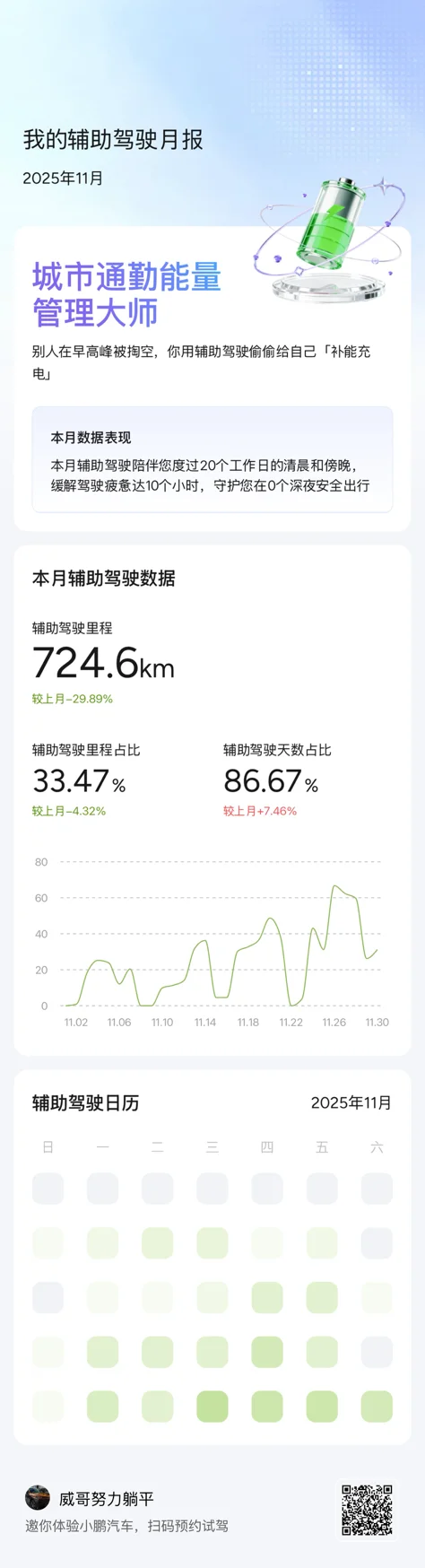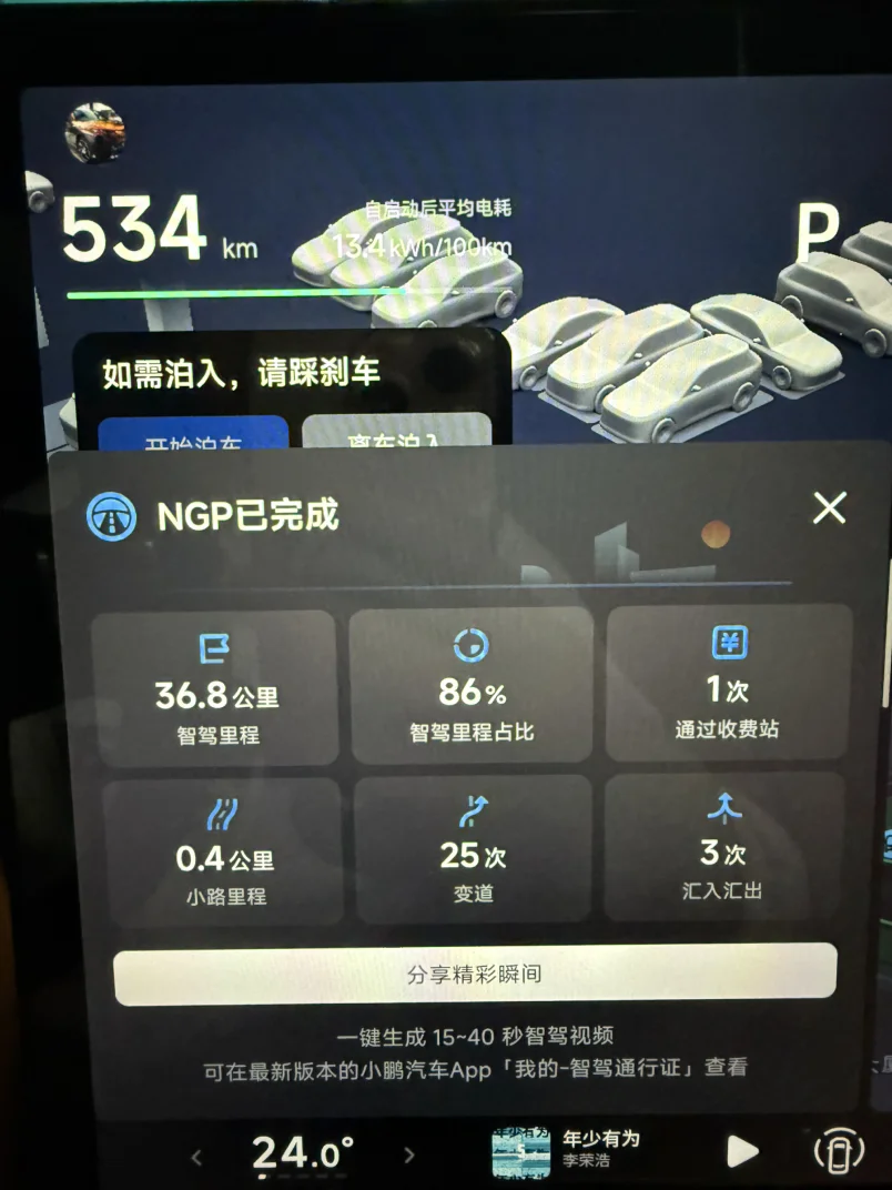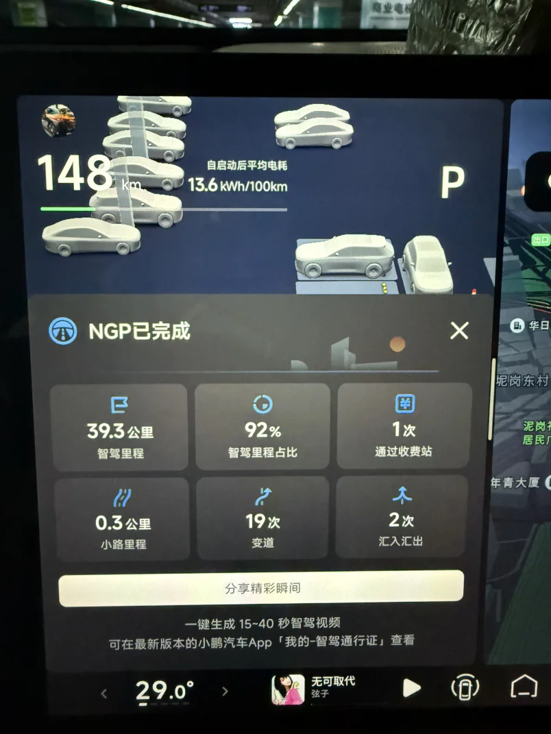 #11月用车总结# 用车2年多以来,我一直都是NGP的中度使用者。从23年的4.3版本到现在的5.7,从以前的旧车机系统到天玑,虽然每个版本体验感不一样,能力也有区别,但一直坚持再用,早已经成为习惯。这2年多一直见证了NGP和小鹏汽车的成长。我主要用车环境是上下班通勤,在11月,5.7.8版本的NGP使用率其实只有50%,到上周更新了5.8.5之后,使用率直接飙升到90%左右,在早高峰繁忙时段,NGP极强的通行能力一点都不耽误我上班。👍@鹏友俱乐部
