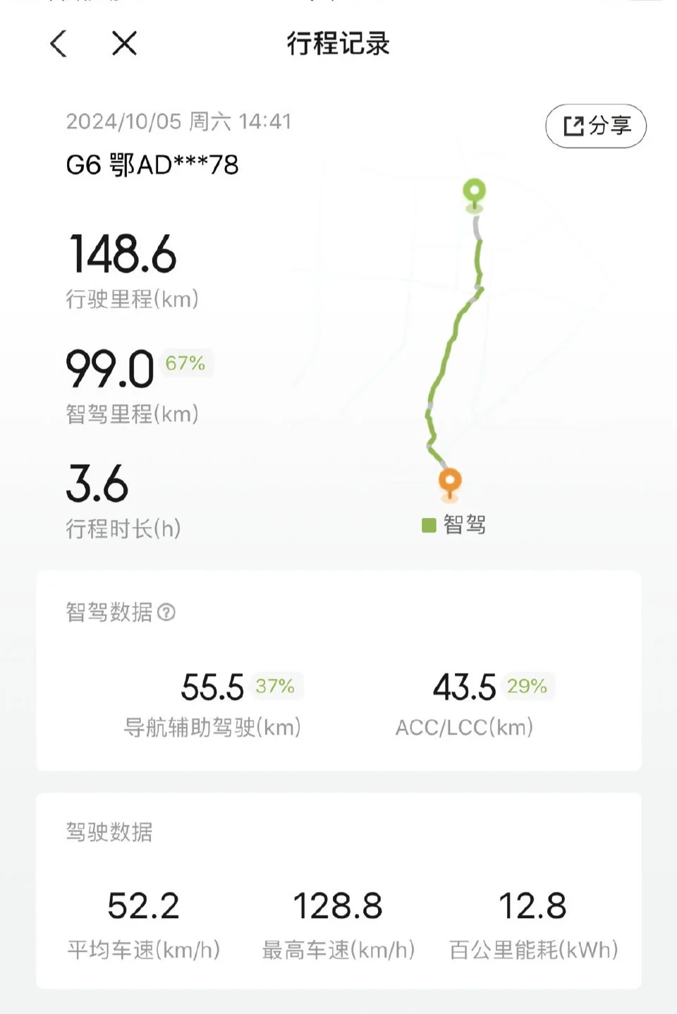 因为离长沙还有150公里左右,为保险起见,在附近快冲站充了10多分钟电到300公里续航后赶赴长沙。岳阳到长沙明显车流量大了很多,但是也没有堵车,因为NGP有时爱自己变道,有点吓人,于是车流量大时只用LCC跟车。到长沙定的酒店148公里,开了3小时半,平均能耗12.8,剩余大概120公里。当晚到太平老街吃各种长沙小吃。听说长沙各地不好停车,果断报了第二天的跟团一日游。次日,游览了橘子洲头、湖南省博物院、岳麓书院和爱晚亭。此处省略5000字。第三天,10月7日上午退房后开车到华谊电影小镇玩了一上午,中午饭后先找到附近的小鹏专用充电桩,40分钟后从90公里充到455公里满电出发返回武汉。