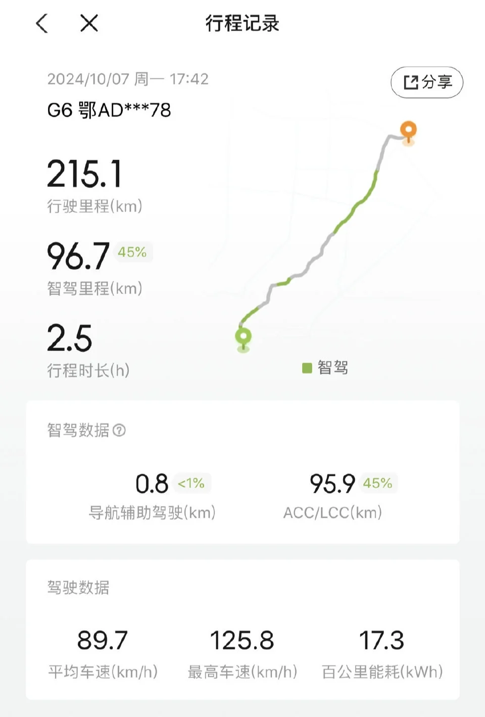 已经做好大堵车的充分准备,没想到一路畅通,只是车流量有点大,难道大家都怕堵车,都提前返程了?回程天气渐凉,没开空调,车速基本保持110码,LCC模式。下午5:15到达巴陵服务区吃晚饭,开了1.8小时,131公里,平均能耗15.2。饭后接着开车赶路,天也慢慢黑了,继续LCC模式跟车,路上全家都睡着了,我坚持不住还睡着了一小会,车子自己跑了几公里,现在回想起来还感到后怕。最后从巴陵回到武汉家中跑了215公里,花了2小时半,到家已经晚上8:10,平均能耗17.3,因为赶时间,手动模式跑了一段120码的高速。到家还剩48公里。