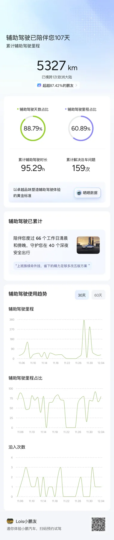 翻小鹏App智驾数据页给我惊到了:107天辅助驾驶5327km,里程占比60.89%、天数占比88.79%,直接超越87.42%的鹏友——这哪是辅助,明明是我的“全职代驾”!