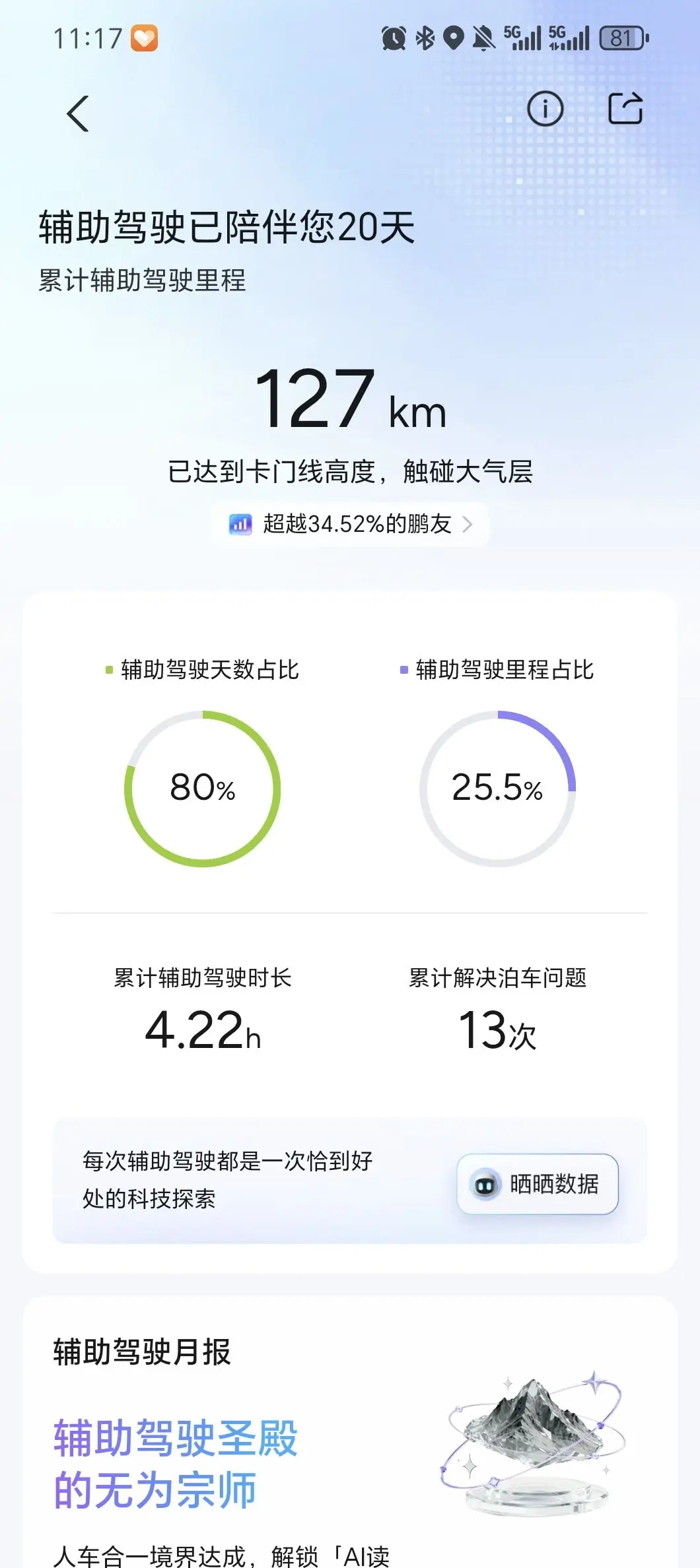 #11月用车总结# @鹏友俱乐部 11月份是我提车的第一个月份,用车20天,总体来开着还是很不错的(智驾版本是XOS.5.8.5.8906,之前是那个版本我没有记住),新版本的智驾我个人觉得太丝滑了。续航的话,车在北京,每天上班下班提前加热(提前打开空调,座椅加热,方向盘加热,室外温度基本都在0下),能耗基本都在16-17左右。不知道大家的能耗都在多少