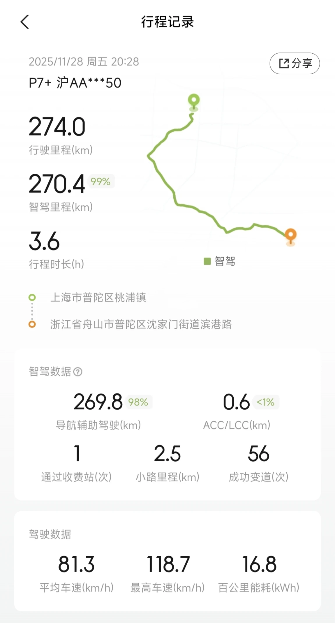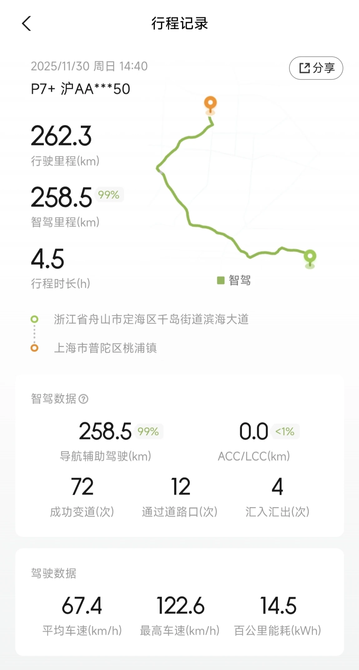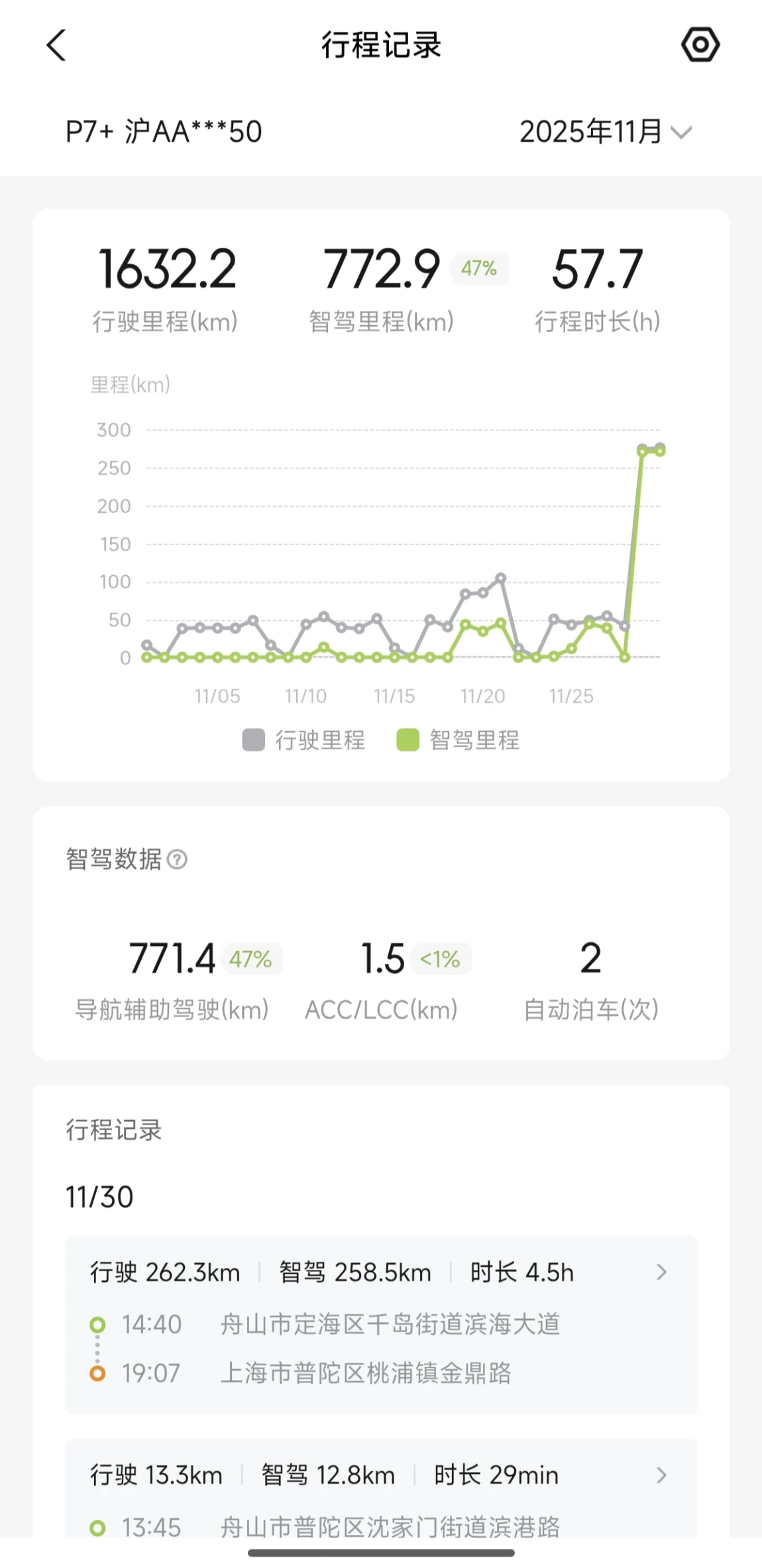 #11月用车总结# 回顾整个11月跑的路不算特别多,不过月底全家一起去了趟普陀山,刚好中了首批推送的585版本正好能用的上,所以几乎全程NGP,虽然城市道路还有不足但是跑高速还是非常稳的,去程是大晚上很顺畅,回程比较堵但因为有NGP的辅助并不是特别累,另外回程出发前补了一下电,峰值350kw的速度非常快,高速上的能耗表现也不错,总体上P7+这车跑长途还是非常适合的