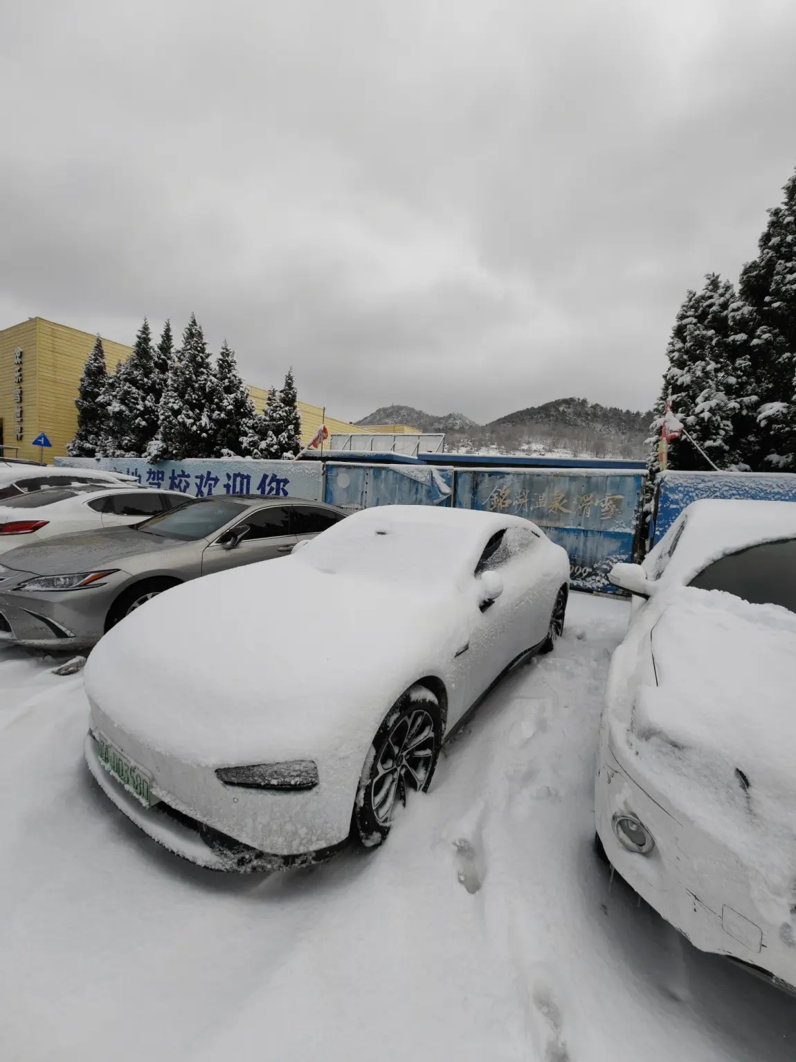 #最美冬日驾驶路线# 一觉醒来,车子全被雪盖得严严实实,像裹了层厚棉被似的,周围的松树也都顶着白帽子,山尖藏在云里若隐若现。路边捡到片超大的枫叶,放在车轮上正好成了个天然装饰,这趟自驾的小惊喜真是藏在每个细节里,冬天的浪漫果然都在路上。