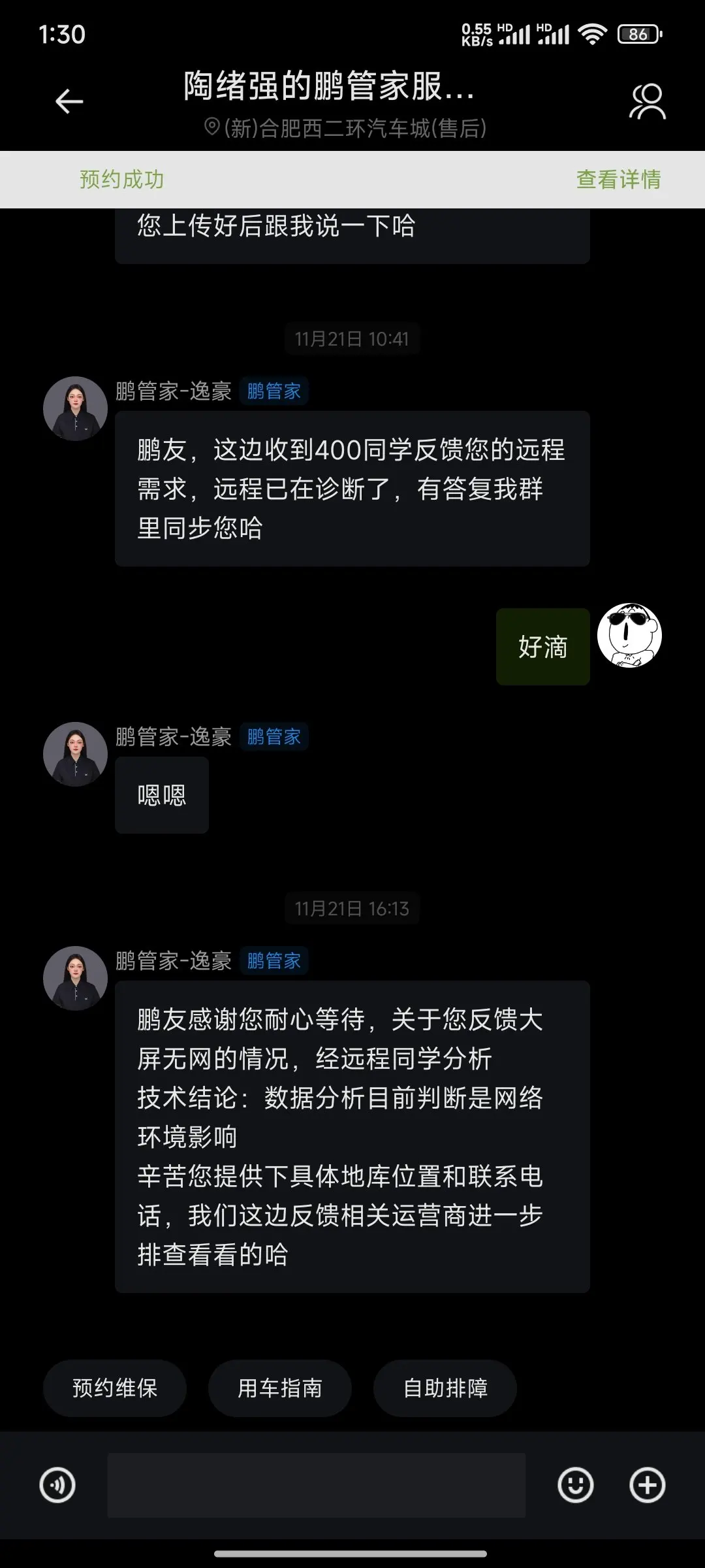 途中在地库遇到无网小插曲😅,没想到联系鹏管家后秒响应,专业又高效地帮我解决了问题,后续还贴心回访确认是否顺利,这份“事事有回应”的服务真的超暖心❤️!这个月,既有山水秋景的治愈,又有智能座驾的靠谱陪伴,还有暖心服务的加持,每一段旅程都值得好好珍藏,期待下一次和小鹏解锁更多精彩~