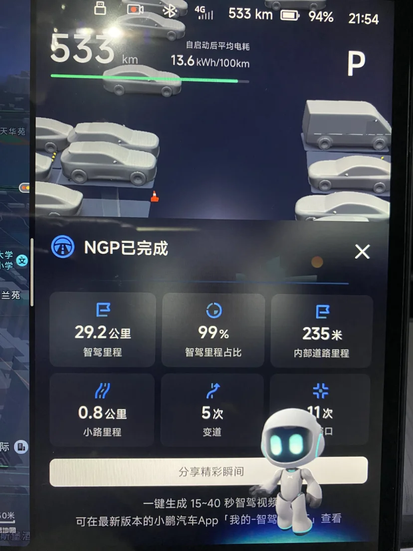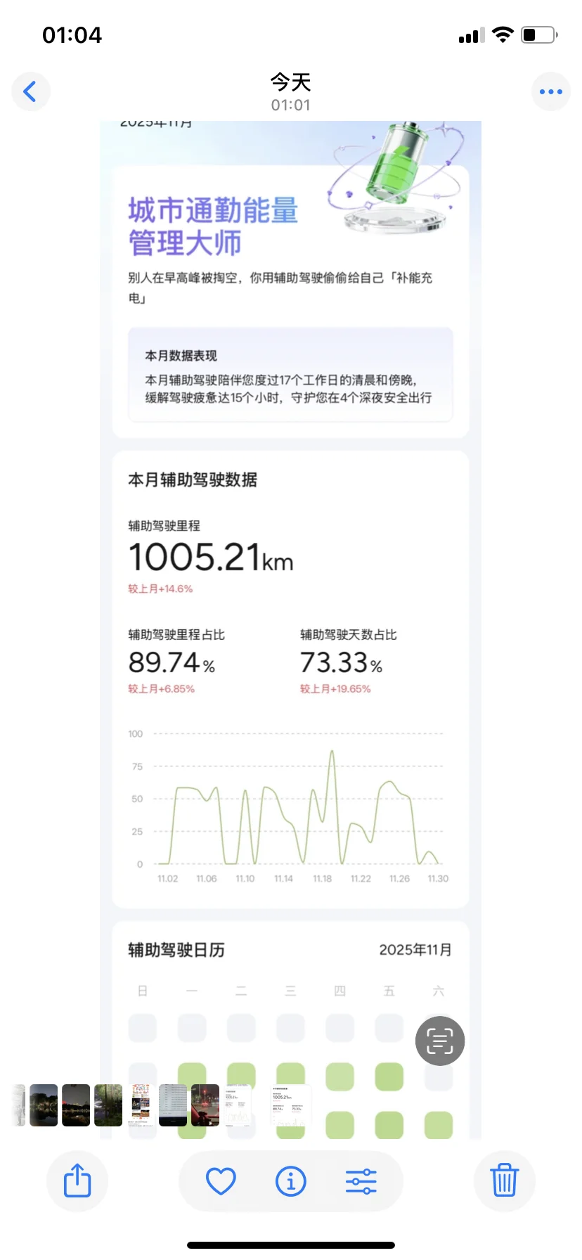 #11月用车总结# @鹏友俱乐部 我的2025款小鹏G6自从更新了XOS 5.8.5.8905版本,智能辅助驾驶功能我用得更多了!11月智能辅助驾驶1005.21公里,占比高达89.74%,自动泊车50次!作为一名广佛候鸟,跨市通勤,智能驾驶让我的通勤之路轻松愉快,从夜间NGP使用来看,夜间变道,主辅路切换,通过复杂路口,都是精准无误!特别是加班比较晚的情况,NGP让我回家更安全!目前来说人机共驾功能用起来很丝滑,车位到车位的新功能很赞!11月在小鹏自营充电站充了258.6度电,充电速度快又稳,每次半个小时内搞定,必须赞一个!