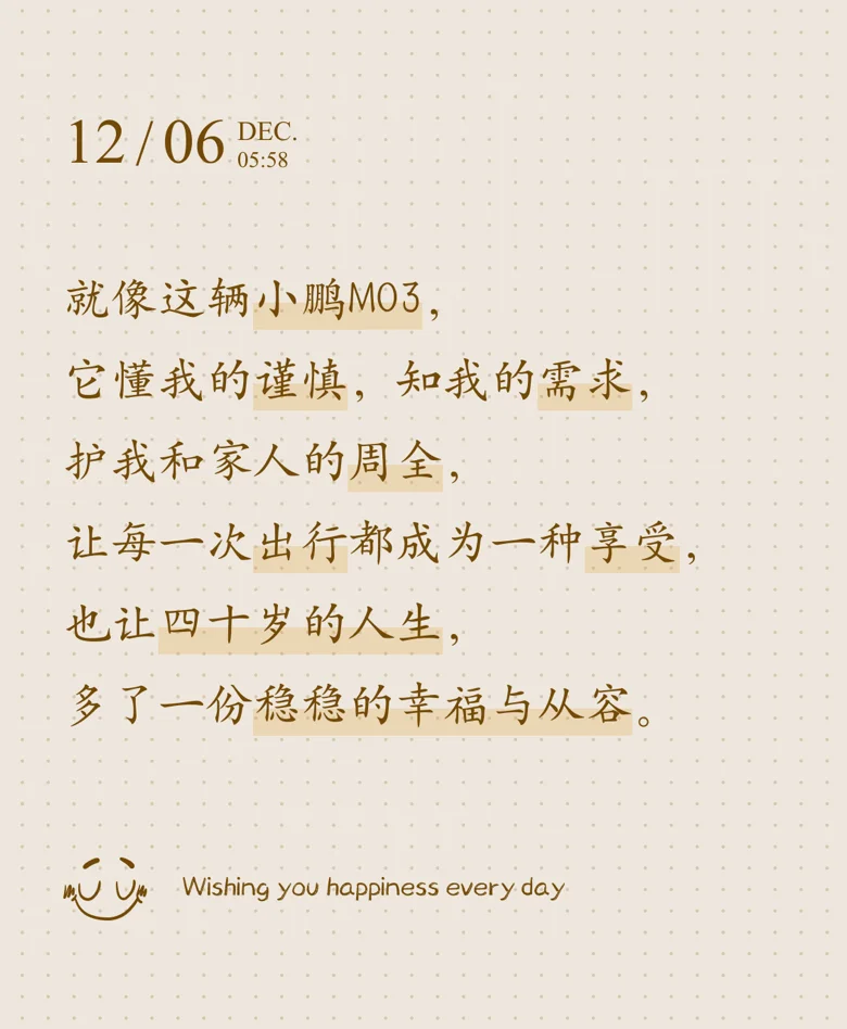 四十岁的幸福,莫过于选对一辆懂你的车。小鹏M03 Max的夜幕紫藏着我的审美,19寸轮毂护着我的旅途,智能配置懂我的需求。它不只是代步工具,更是陪我穿梭柴米油盐的伙伴,载着家人的牵挂与自己的从容,奔赴每一段平凡却珍贵的时光。
