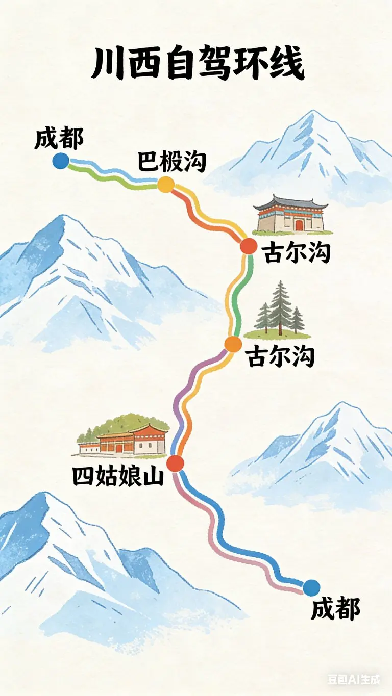 - 起终点:成都市区 → 毕棚沟 → 古尔沟 → 四姑娘山 → 成都市区