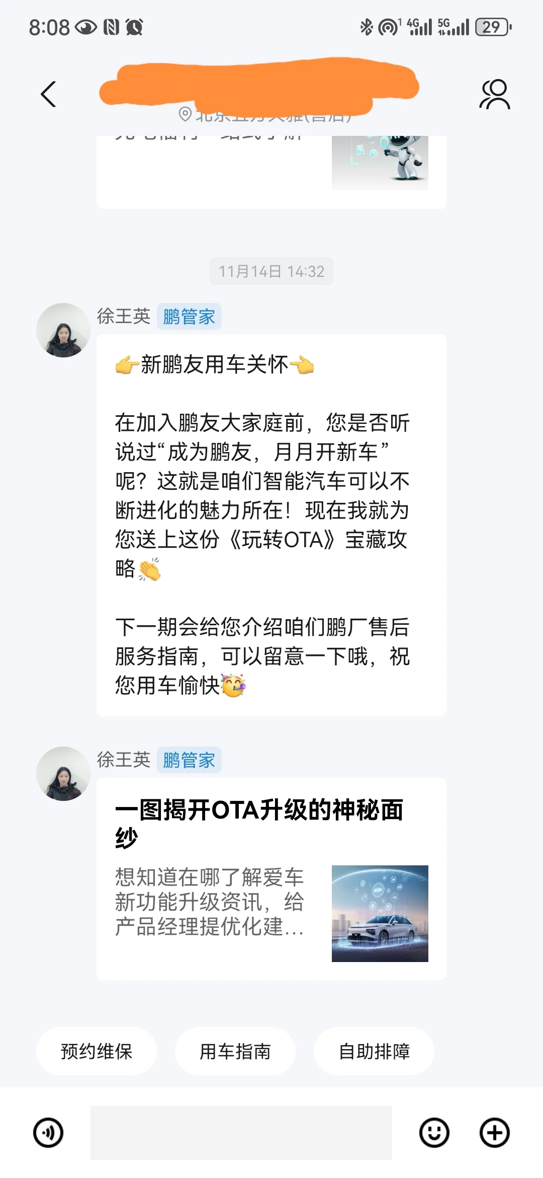 因为用车不久,关于他们的服务目前也只是体验了前端销售,提车和买车后的群管家的服务,整体是很满意的,销售很实在,群管家也是定期的给推荐一些用车小技巧,群管家发的一些内容我基本上都是会看的,对于车辆的熟悉有很大的帮助,偶尔也会在群里问一些问题,回答的也很积极,我觉得这种状态我就知足啦,不知道大家在用车的过程中对小鹏的MOT有哪些优点和缺点咱们可以交流交流[呲牙]#小鹏汽车# #小鹏汽车、#小鹏智能服务、#小鹏MOT服务