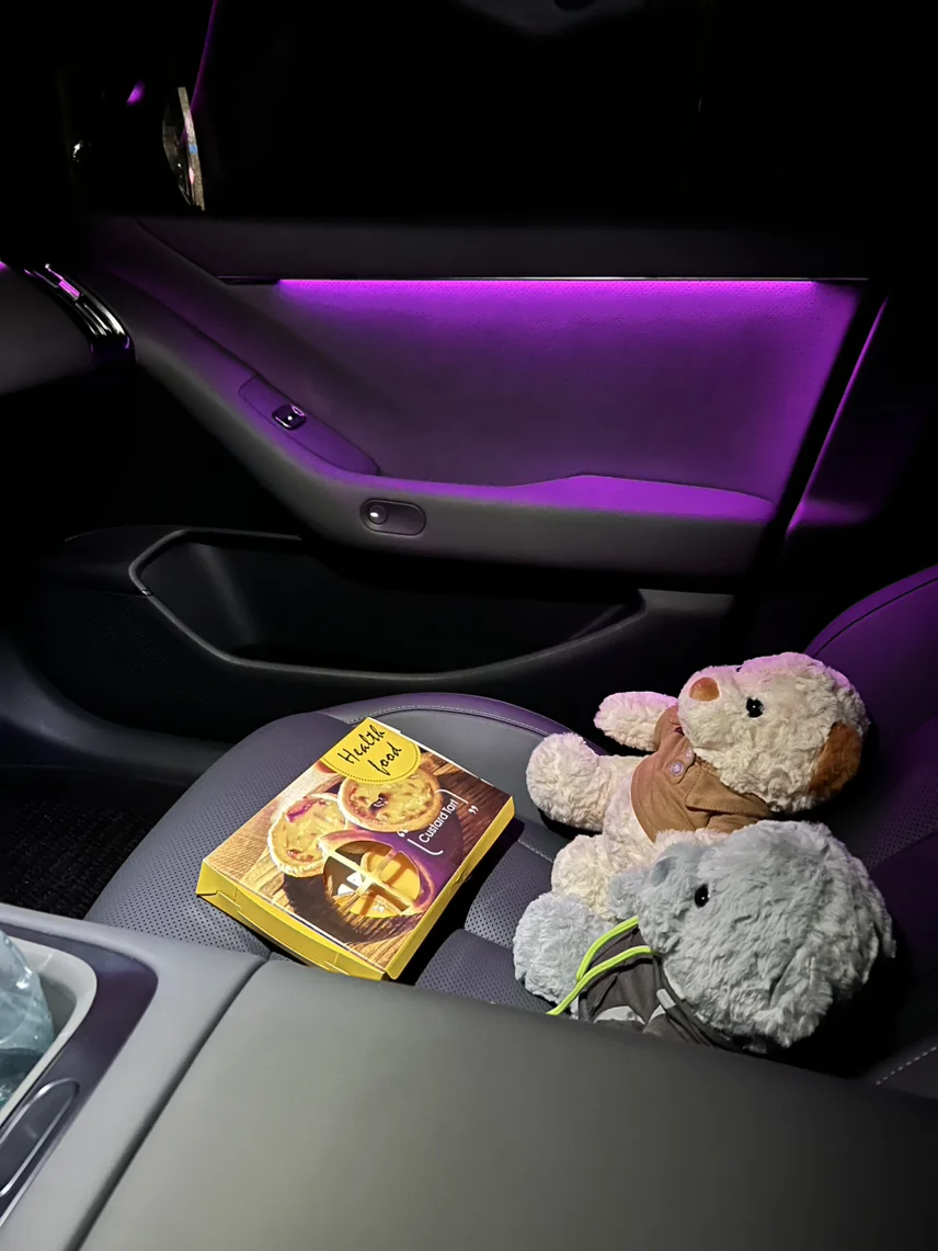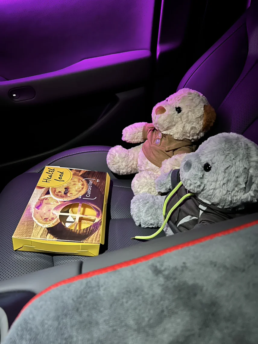 #我的副驾故事# 我的P7+副驾,今天正式更名为「甜蜜补给站」!🐻➕🍮 副驾的两位“安全员”——小灰和小黄,每天监督我安全驾驶。而今天,它们的任务多了一项:守护我刚刚出炉、还热乎的一打蛋挞! 开车回家的路上,整个车厢都是蛋挞的奶香味。等红灯时偷偷瞄一眼,金黄酥脆的样子太诱人了。副驾座椅调成最舒适的角度,旁边放着我的“宝贝蛋挞”,小熊们仿佛在说:“主人,到家再吃哦!” 谁能拒绝一个会陪你冒险、等你回家,还能装满幸福的副驾呢?这就是我的专属移动甜蜜空间。