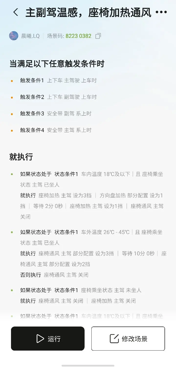 从上车的那一刻起,系统会根据车内外温度自动调节主副驾座椅的加热或通风,天冷时座椅和方向盘会先以3挡快速升温,两分钟后自动降到1挡,天热时通风也会智能调节档位,完全不用手动操作,跟着我设置场景码:82230382;进入小鹏App,智慧场景搜索即可查看;这个冬天再也不用冻屁股和冻手啦!