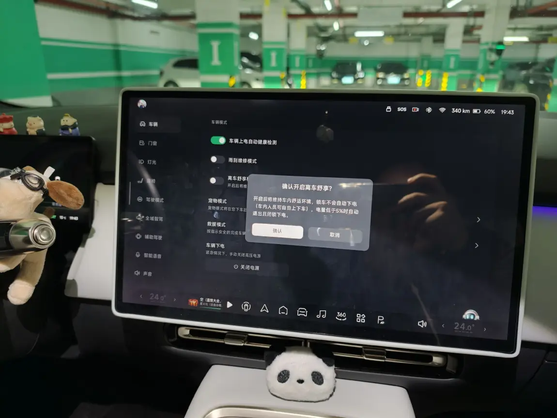 冬天里,座椅加热也是必不可少的。直接对小P说“打开座椅加热”,很快座椅就会变得暖暖的。此外,刚更新的离车舒享模式也很实用。比如有时带着孩子进了小区,我需要去取快递,让孩子独自在车内等候,这时就可以开启离车舒享模式。开启后,车辆会保持全车通电,动画片可以继续播放,同时车门会锁止,确保其他人无法从外部打开。另外,离车舒享模式还能添加到Dock栏,方便快速开启。