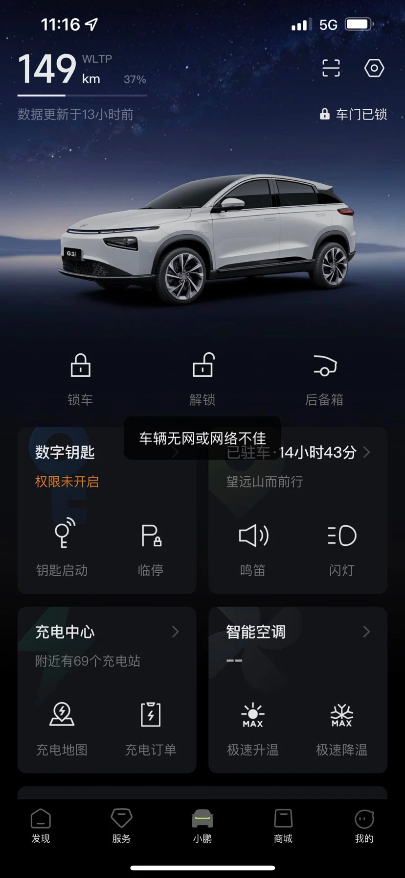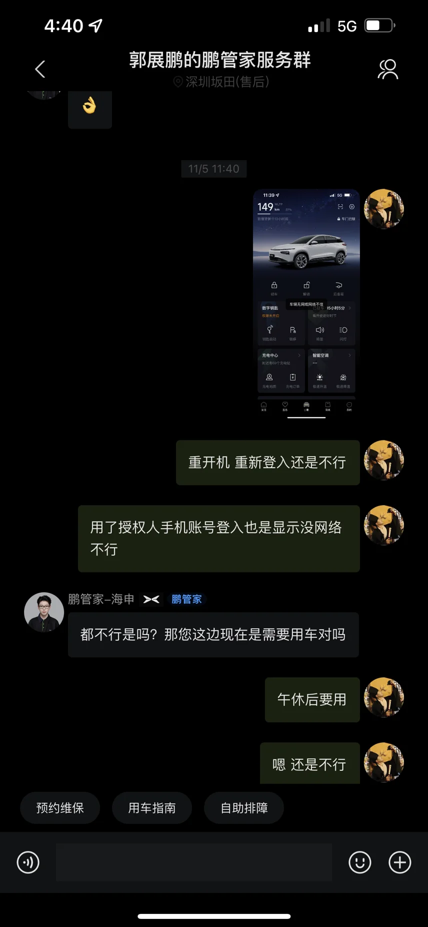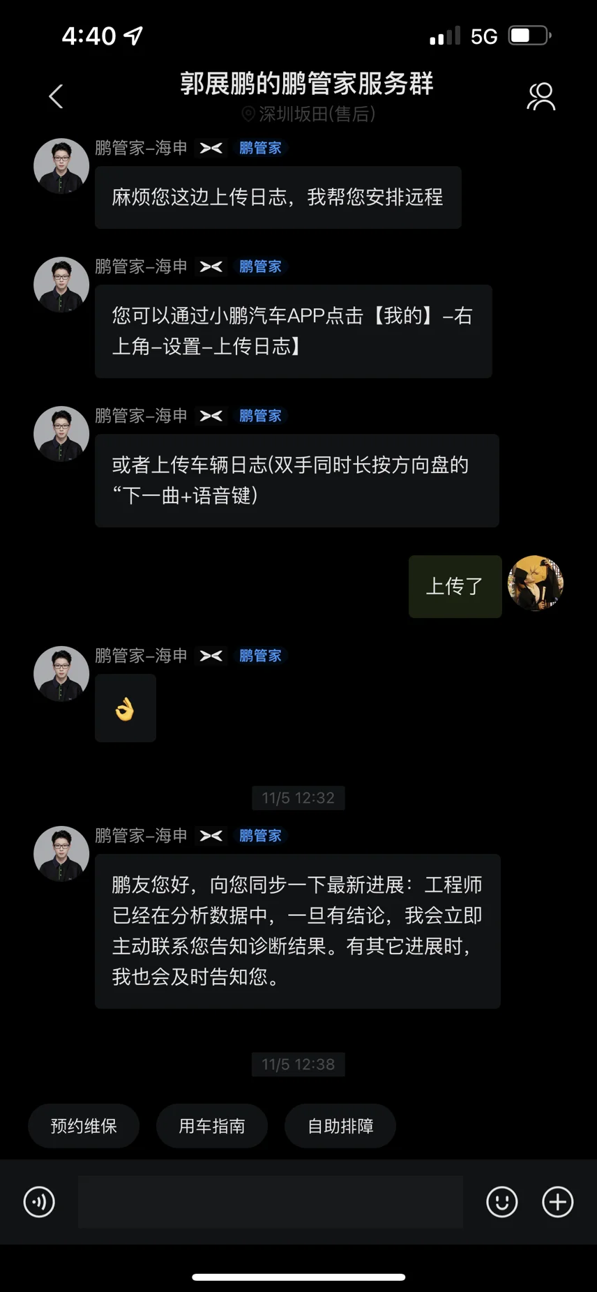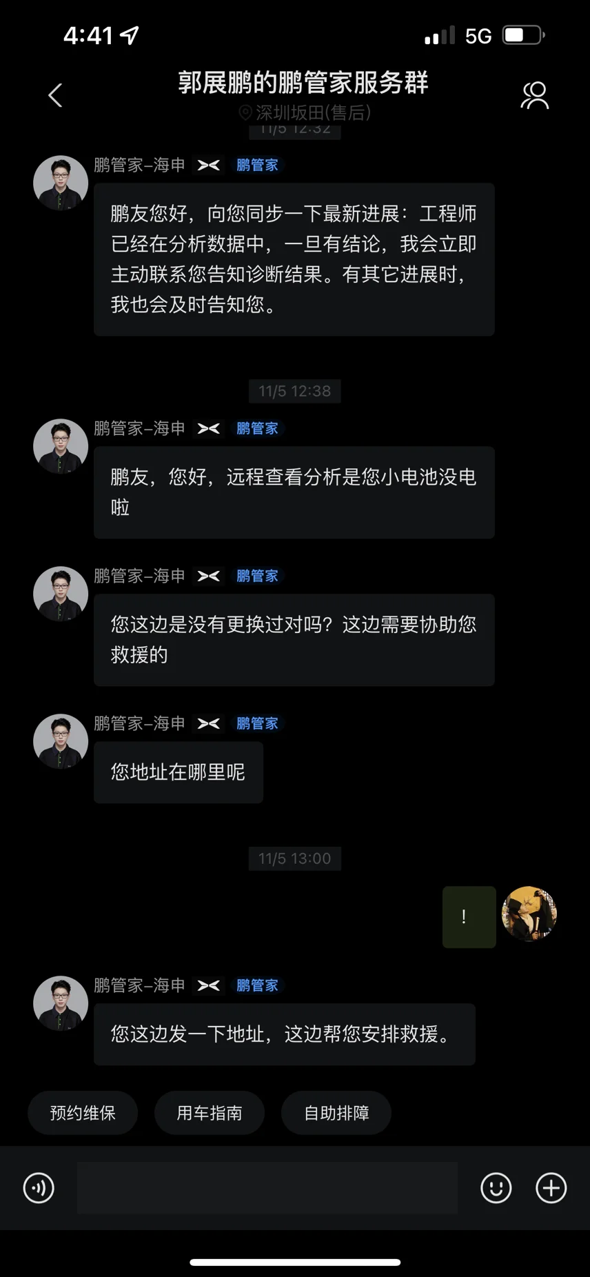 #小鹏汽车 #智能远程诊断 #小鹏智能服务 上个月小鹏汽车APP出现车辆无网或网络不佳的提示情况,我检查了手机网络信号满格无网络不佳的情况,所以可能是车辆无网络了,这是为啥…我带着疑问找了小鹏app上的专属售后服务群询问。按照客服群管家的指引重启了手机并退出了小鹏APP账号重新登入依然不行,我用授权家人登入的小鹏APP账号照此流程也操作了一遍还是不行。反馈给客服群管家,最后按照提示操作了小鹏APP上传车的日志,经过一会的等待,得到的答复是用了四年的蓄电池没电了……给了地址给管家帮我安排了小鹏救援上门接电启动了车辆,然后开去了附近的小鹏4S店用去年小鹏成立十周年发放的半价蓄电池卷换了蓄电池,加工时费300块左右,用小鹏积分抵扣,结算零元。值得一提的是小鹏免费救援也可以带上全新的蓄电池上门更换,但我离小鹏门店近就自己开到店里了。