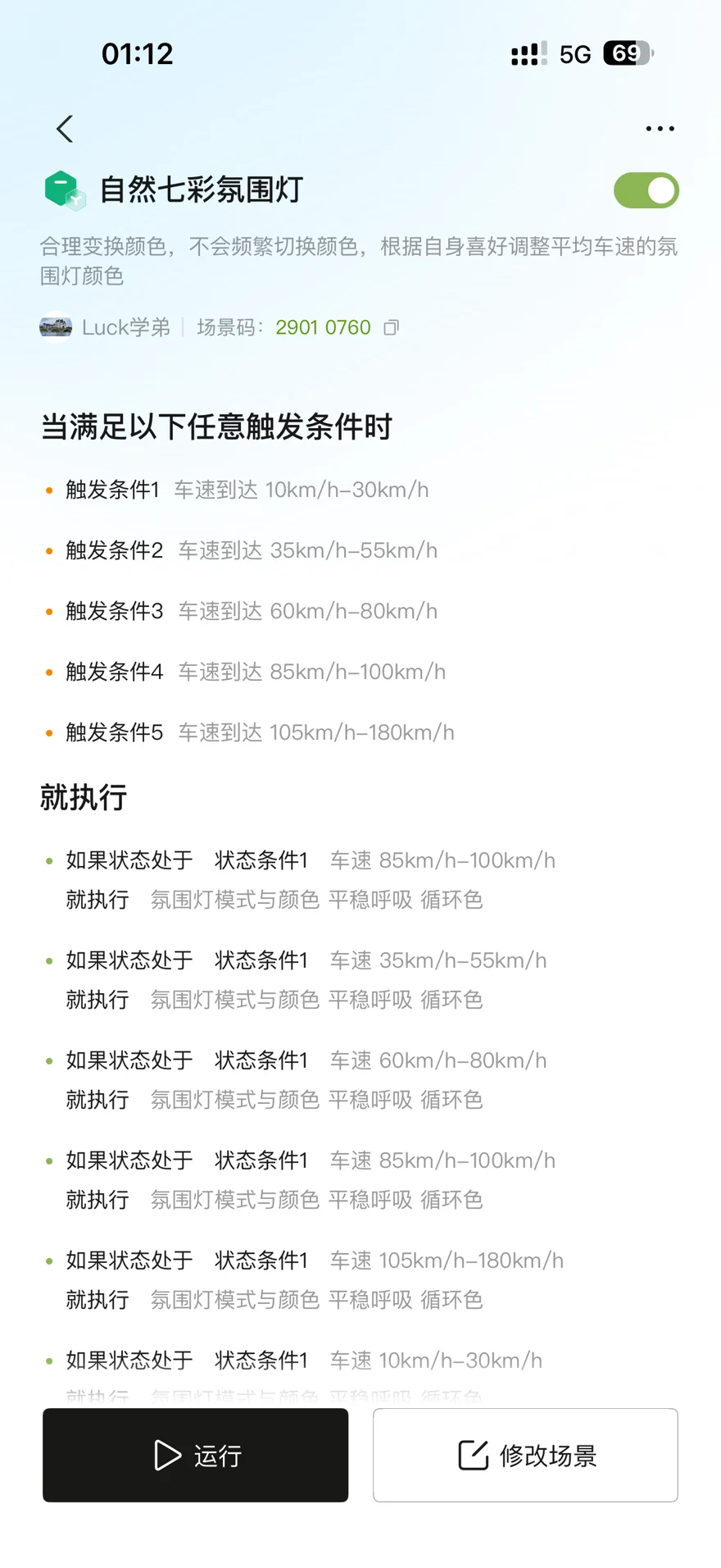 1:智慧场景个性化,可以自定义自己需要搭配的联动功能,比如氛围灯可以自定义颜色根据车速进行变化使车内氛围感满满。