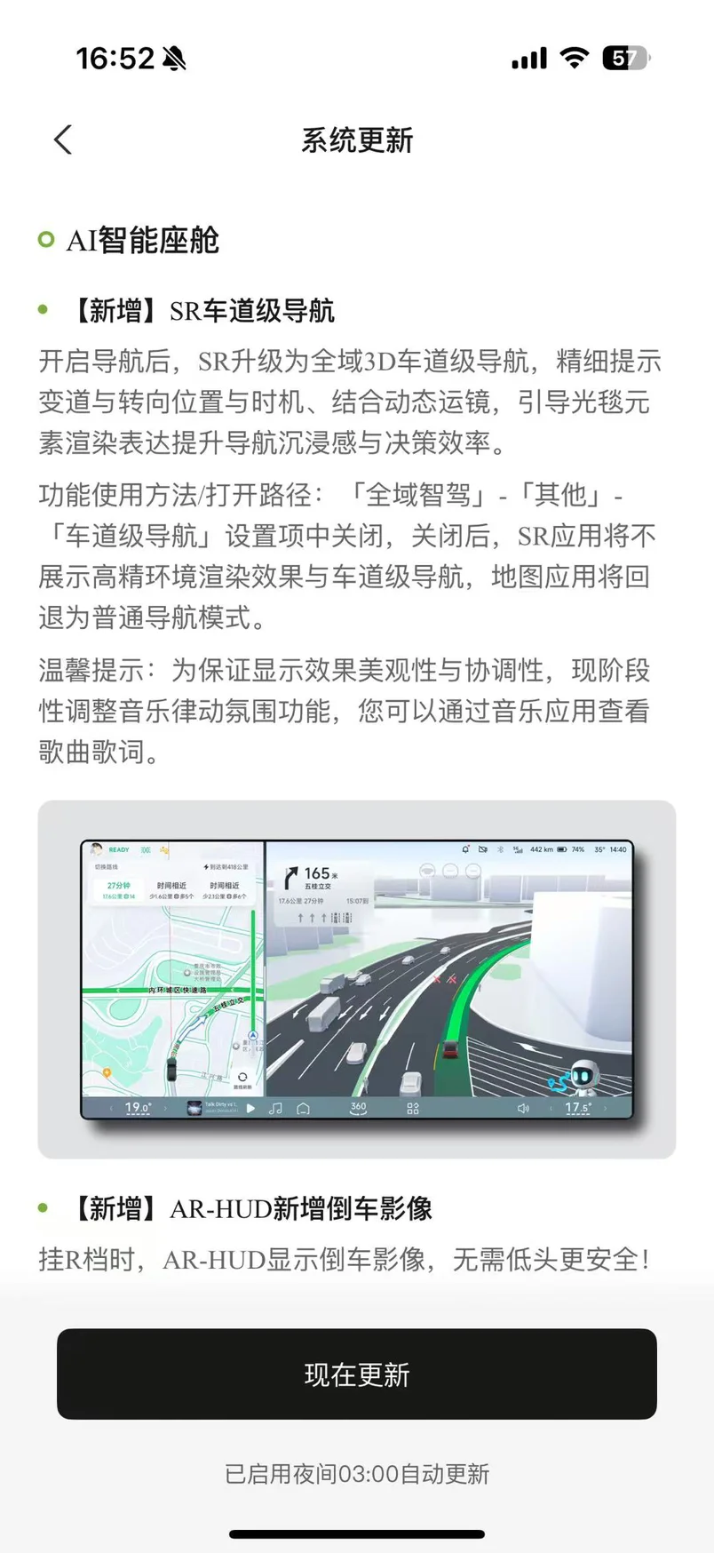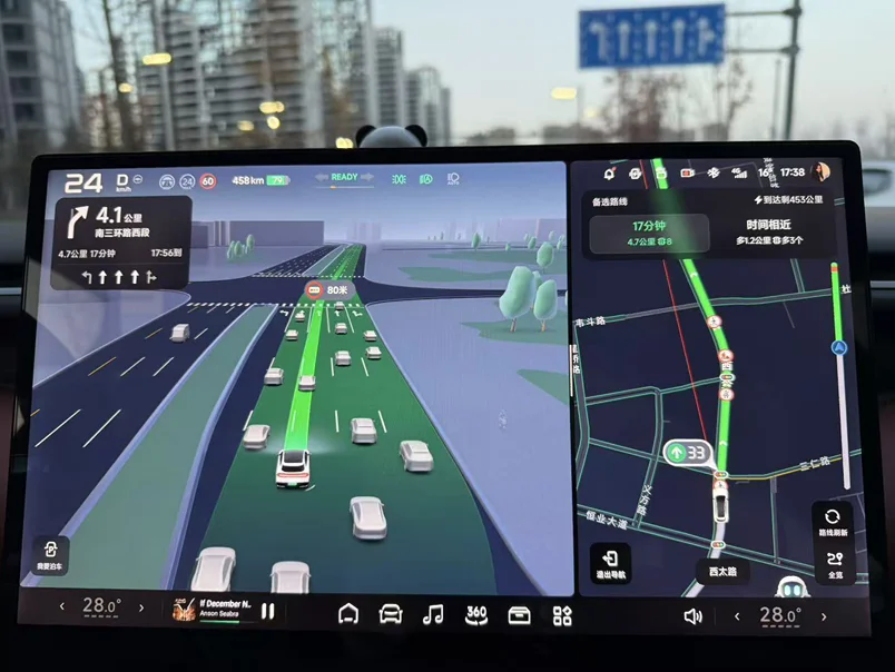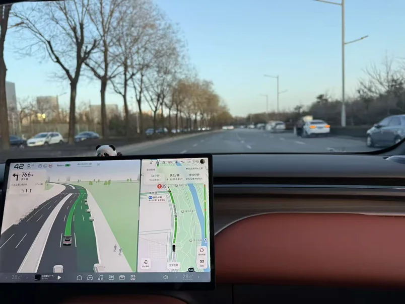 刚给小鹏G7更完XOS 5.8.5版本,这SR车道级导航直接封神!87英寸超大画幅把导航路线“画”在路面上,绿色光毯精准贴合车道,完全不用低头看屏幕。