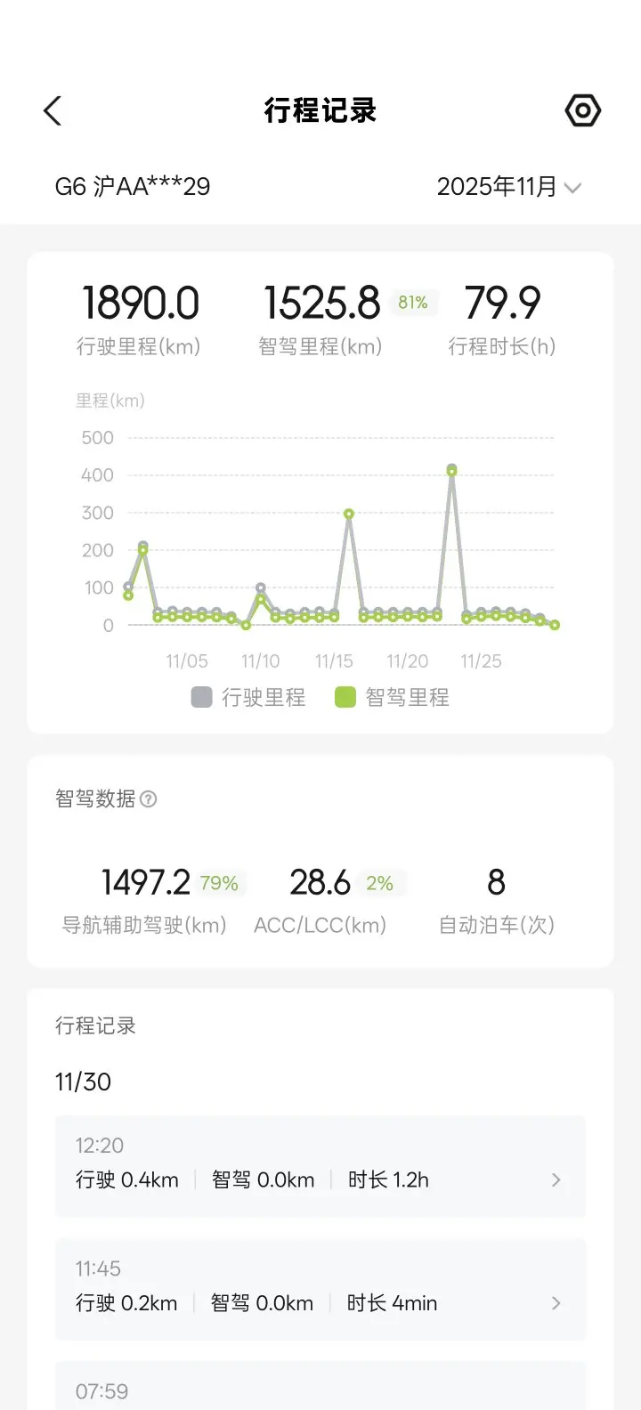 #11月用车总结# 11月我的小鹏G6累计跑了1890公里,通勤、近郊出游的行程全靠它支撑。最惊喜的是81%的智驾比例,不管是城市早高峰的拥堵路段,还是高速长途,XNGP系统都能平稳应对,自动跟车、变道超车丝滑流畅,大幅减轻了驾驶疲劳。 更值得一提的是,整月平均电耗仅12kWh/100km,即便频繁开启智驾和空调,能耗依旧保持在低水平,既省钱又省心,妥妥的出行好搭档!@鹏友俱乐部