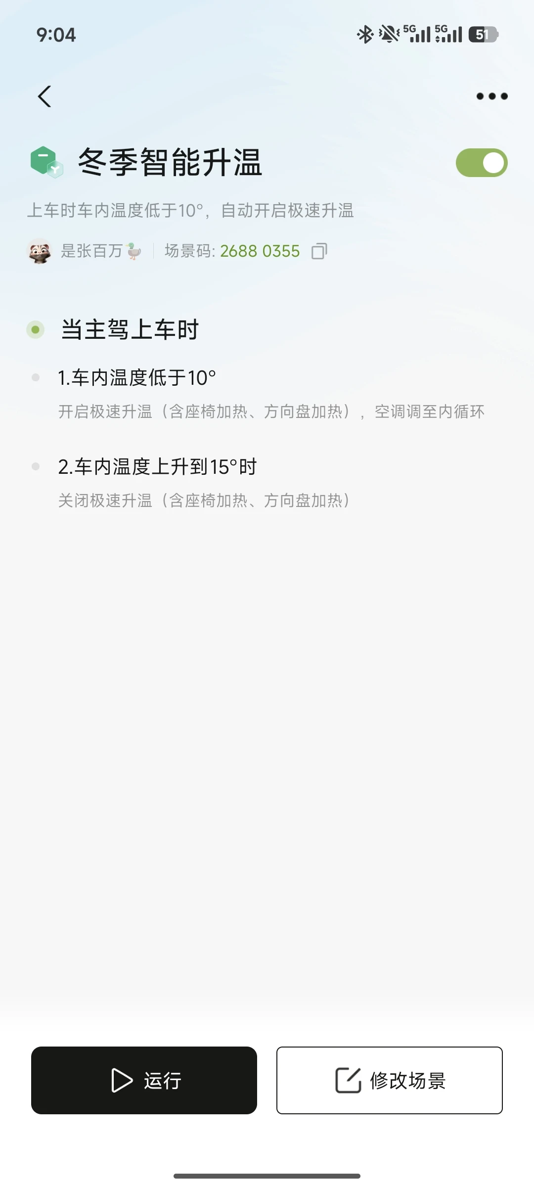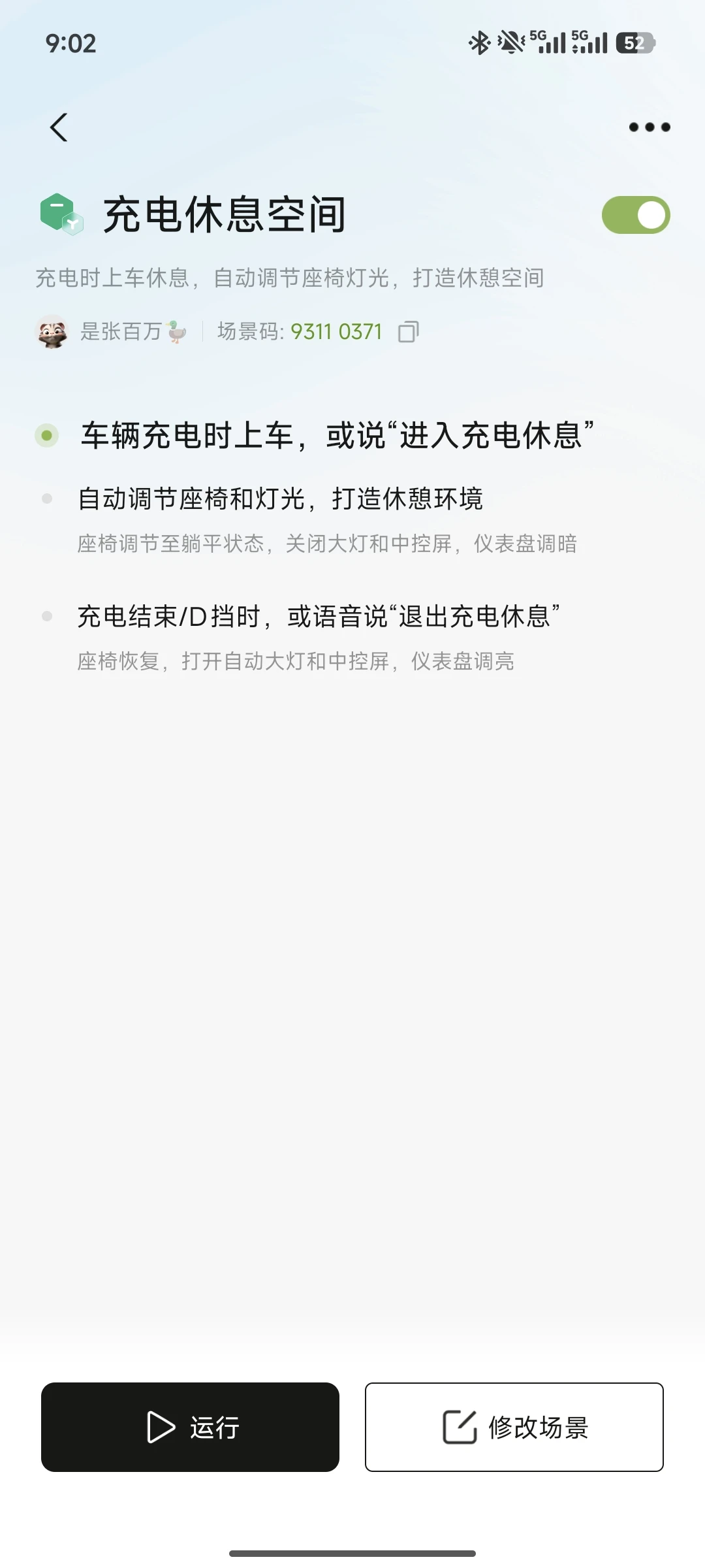 其中最好用,最方便的就是智慧场景了,提前设置好充电休息空间,插上充电枪后回到主驾,会自动放平座椅,关闭灯光,充电时可以好好放松一下,缓解疲劳!冬天设置智能升温,当车里温度低于10度,会自动调节空调,打开座椅加热 方向盘加热,驱赶寒冷 拥抱温暖,这对于北方的小伙伴们,真的太刚需啦!