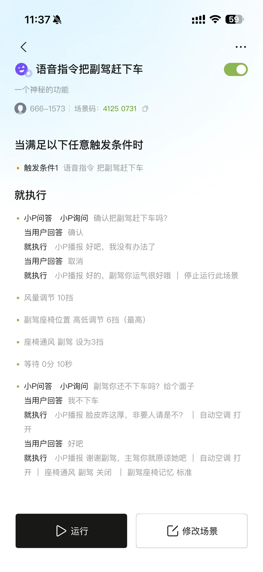 #2025年我最喜爱的智能座舱功能# @鹏友俱乐部 @智能座舱小助手 分享几个目前用起来最方便的智慧场景,我的系统版本是最新的5.8.5版本,第一个出门在外的时候只要离车自动开启哨兵模式,并且可以根据当前剩余电量自动判断,相当的方便。第二个是娱乐性拉满的副驾弹射模式,车内噪音开到最大很像火箭发射场景,假装把副驾直接发射出去。第三个是充电休息场景,小p直接将座椅和灯光调节至休息角度和亮度,十分适合充电时休息场景。