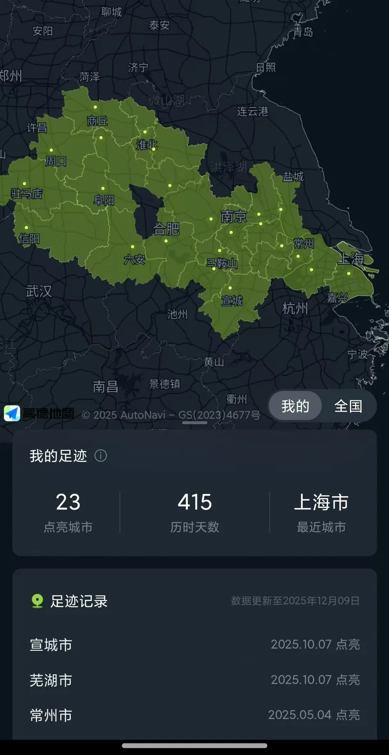 这741天跑了5万多公里,足迹从上海散到23个城市,最近一次是10月在宣城、芜湖转了圈。
